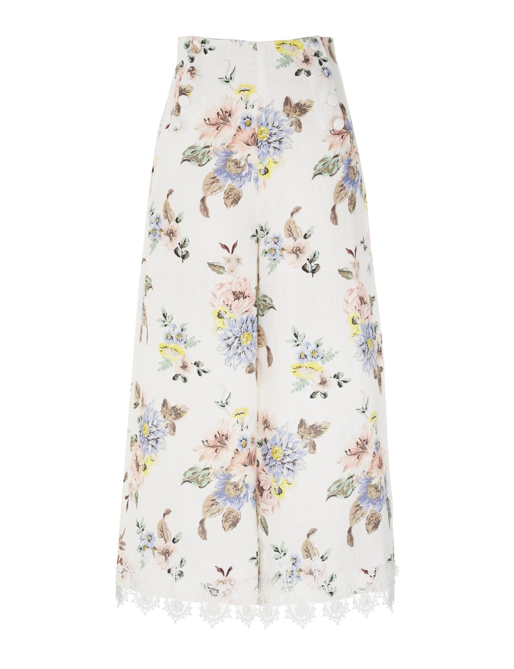 ITEM DETAILS The Applique Culottes in Blue Floral from our Resort 2024 Collection, Matchmaker. A linen culotte featuring a fixed high waist and lace trims throughout. - Linen - Flared culotte - Sailor button closure - Applique lace trims - Side hip pockets - Invisible zip closure Style Code: 3072PRMAT SIZE DETAILS 0P 0 1 2 3 4 Length 85 92 93 94 94 95 Waist 78 82 88 94 98 104 Hip 92 96 102 108 112 118 Inseam 54 59 59 59 59 59 Fixed high waist Relaxed through legs This garment fits true to size Available in size 0P, suited to clients who are under 5'3"/ 160cm Model is 5'9.5"/178 cm, bust size 32C/10C and wears a size 0 Item measurements have been rounded to the nearest cm. CARE INSTRUCTIONS Main: 100% linen Contrast: 100% cotton Exclusive of trims Dry clean only code f (hydrocarbon) with protective bag Cool iron with protective cloth Light steam only Do not spot clean Turn garment inside out before dry cleaning Always check the garment care label for specific care instructions.