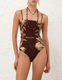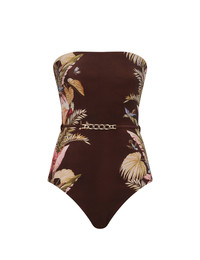ITEM DETAILS The Ascension Bandeau 1PC in Burgundy Palm Floral from our Summer Swim 2025 Collection. A lycra bandeau one piece featuring a shelf bra, boning in the side seams and a removable chain trim belt. - Lycra bandeau with shiny finish - Shelf bra - Gripper elastic front neck - Boning inserted at side seam - Full coverage bottom - Lined Campaign: This style was featured in the Summer Swim 2025 Campaign. Style Code: 4258WSS253 SIZE DETAILS This garment fits true to size Model is 5'10.5"/179 cm, bust size 34C/12C and wears a size 0 CARE INSTRUCTIONS Main: 80% polyamide, 20% elastane; lining: 92% recycled nylon, 8% spandex Do not roll up when wet; Rinse thoroughly after use; Remove any detachable trims prior to washing; Cold hand wash separately with mild detergent, avoid fabric softener; Dry in shade; Do not bleach or iron; Do not tumble dry; Do not dry clean; Light colours may be transparent when wet; Avoid contact with sunscreens, oils and rough surfaces; Avoid high temperature pools and spas treated with harsh chemicals Always check the label or care card for specific care instructions.