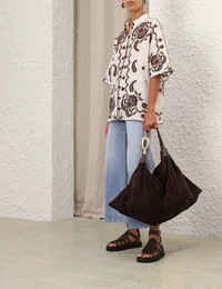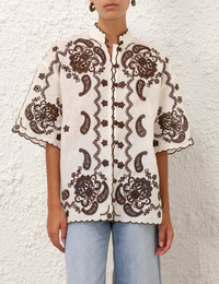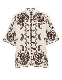 ITEM DETAILS The Ascension Embroidered Shirt in Ivory/Chocolate from our Summer Swim 2025 Collection. A linen shirt featuring embroidery detailing throughout with scalloped edges and self rouleau buttons down the centre front. - 100% linen fabric - Quarter sleeve shirt - Stand collar with scalloped edge - Flower crochet buttons down the centre front - Loose fit Campaign: This style was featured in the Summer Swim 2025 Campaign. Style Code: 3287TSS253 SIZE DETAILS 0P 0 1 2 3 Length 25.5 27 27.5 28 28 Sleeve 10 10.5 10.5 10.5 10.5 Designed for a relaxed fit This garment fits true to size Available in size 0P, suited to clients who are under 5'3"/ 160cm Model is 5'9.5"/178 cm, bust size 32C/10C and wears a size 0 Item measurements are in inches CARE INSTRUCTIONS Main: 100% linen, embroidery: 100% polyester Dry clean only code f (hydrocarbon only); Remove any detachable trims prior to dry cleaning; Cover to protect trim; Cool iron with protective cloth; Light steam only; Do not spot clean Always check the label or care card for specific care instructions.