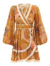 ITEM DETAILS The Ascension Frill Mini Dress in Mustard Palm Floral from our Summer Swim 2025 Collection. A cotton mini dress featuring a plunging V-neckline, long billow sleeves with elasticated cuffs and a self-tie waist, finished with frill pleated detailing throughout. - 100% cotton fabric - Loose sleeves gathered at cuffs - Self-tie belt sewn at the waist - Lace trim throughout - Frilled hem - Lined skirt Style Code: 3245DSS253 SIZE DETAILS 0P 0 1 2 3 4 Length 32.5 34.5 34.5 35.5 36 36.5 Bust 33 34.5 37 38.5 41 42.5 Waist 71 75.5 81 86 90.5 96 Sleeve 25 26.5 27 27 27 27.5 Wrap style bodice for an adjustable fit, relaxed through the skirt This garment fits true to size Available in size 0P, suited to clients who are under 5'3"/ 160cm Model is 5'9.5"/178 cm, bust size 32C/10C and wears a size 0 Item measurements are in inches CARE INSTRUCTIONS Main: 100% cotton; lining: 100% cotton; trim: 100% cotton Dry clean only code f (hydrocarbon only); Remove any detachable trims prior to dry cleaning; Cover to protect trim; Cool iron with protective cloth; Light steam only; Do not spot clean Always check the label or care card for specific care instructions.