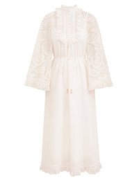 ITEM DETAILS The Ascension Lace Yoke Midi Dress in Cream from our Summer Swim 2025 Collection. A ramie midi dress featuring long, loose sleeves with lace trim, a stand collar and self rouleau buttons down the centre front, finished with a waist tie and frilled hem. - 100% ramie fabric - Long, wide sleeves - Lace trim detailing along collar, sleeves and hem - Removable self tie belt at waist - Invisible zip closure at center back - Comes with separate slip Style Code: 3402DSS253 SIZE DETAILS 0P 0 1 2 3 Length 46.5 51 51 51.5 51.5 Waist 48 49.5 52 53.5 56 Sleeve 23 25 25 25.5 26 Designed for a relaxed, loose fit This garment fits true to size Available in size 0P, suited to clients who are under 5'3"/ 160cm Model is 5'9.5"/178 cm, bust size 32C/10C and wears a size 0 Item measurements are in inches CARE INSTRUCTIONS Main: 100% ramie; contrast: 57% cotton, 43% polyamide; slip: 86% recycled polyester, 14% elastane Dry clean only code f (hydrocarbon only); Remove any detachable trims prior to dry cleaning; Cover to protect trim; Cool iron with protective cloth; Light steam only; Do not spot clean Gentle cold hand wash separately with mild detergent; Remove any detachable trims prior to cleaning; Cover to protect trim; Do not soak, rub or wring; Do not bleach; Dry in shade; Cool iron with protective cloth; Do not tumble dry; Do not spot clean; Dry cleanable code f (hydrocarbon only); Always check the label or care card for specific care instructions.