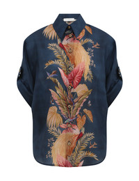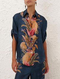 ITEM DETAILS The Ascension Relaxed Shirt in Dark Blue Palm Floral from our Summer Swim 2025 Collection. A silk habutae shirt featuring a bold print, a classic collar and crochet buttons down the centre front, finished with rolled cuffed sleeves. - 100% silk fabric - Short sleeves - Rolled cuffs with button - Loose fit Style Code: 3573TSS253 SIZE DETAILS 0P 0 1 2 3 4 Length 26 27.5 28 28.5 28.5 28.5 Sleeve 14 14 14 14 14 14 Designed for a relaxed fit This garment fits true to size Available in size 0P, suited to clients who are under 5'3"/ 160cm Model is 5'9.5"/178 cm, bust size 32C/10C and wears a size 0 Item measurements are in inches CARE INSTRUCTIONS Main: 100% silk Dry clean only code f (hydrocarbon only); Remove any detachable trims prior to dry cleaning; Cover to protect trim; Cool iron with protective cloth; Light steam only; Do not spot clean Always check the label or care card for specific care instructions.