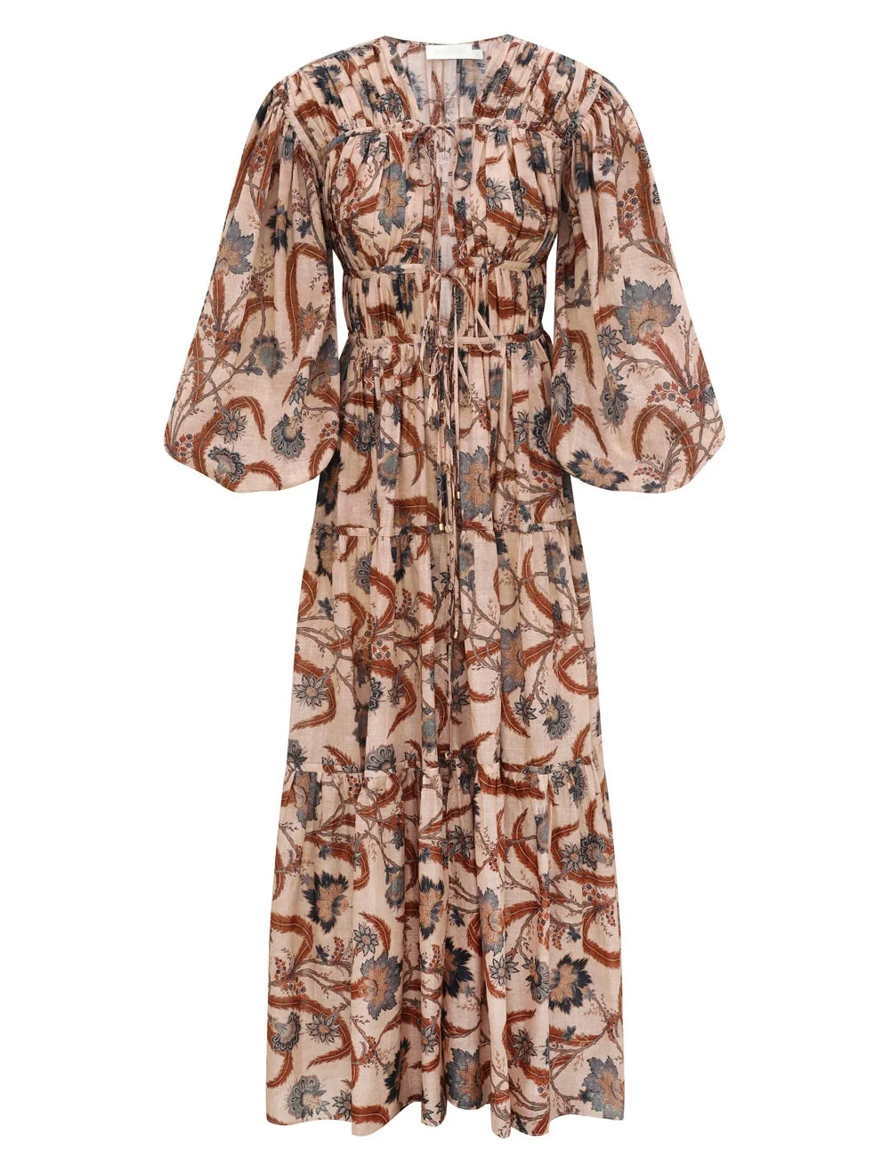 ITEM DETAILS The Ascension Tie Billow Maxi in Blue Indienne Floral from our Summer Swim 2025 Collection. A cotton maxi dress featuring a plunging V-neckline, long billow sleeves with elasticated cuffs and drawstrings across the center front, finished with a pleated tiered skirt. - 100% cotton fabric - Loose, long sleeves gathered into cuffs - Self-rouleau ties across bust, waist and hips - Concealed buttons down the centre front - Shirring throughout - Functional side pockets - Pleated skirt Style Code: 4208DSS253 SIZE DETAILS 0P 0 1 2 3 Length 51 56 56.5 56.5 56.5 Bust 30.5 33 34.5 37 38.5 Waist 26 27.5 30 31.5 34 Sleeve 22 23.5 24 24.5 24.5 Designed for a relaxed fit This garment fits true to size Available in size 0P, suited to clients who are under 5'3"/ 160cm Model is 5'9.5"/178 cm, bust size 32C/10C and wears a size 0 Item measurements are in inches CARE INSTRUCTIONS Main: 100% cotton Dry clean only code f (hydrocarbon only); Remove any detachable trims prior to dry cleaning; Cover to protect trim; Cool iron with protective cloth; Light steam only; Do not spot clean Always check the label or care card for specific care instructions.