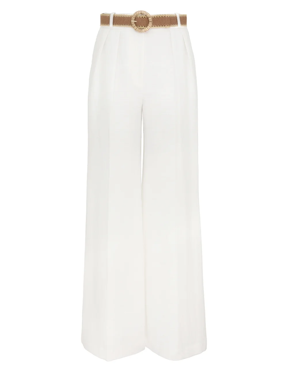 ITEM DETAILS The Aster Flare Pant in Ivory from our Summer Swim 2026 Collection. A high waisted linen pant featuring centre front leg tucks, side hip pockets and a removable faux raffia belt. - Linen wide leg pant - Deep leg tuck - Front zip closure - Hook and bar closure on waistband - Removable waist belt Style Code: 1202PSS261 SIZE DETAILS 0P 0 1 2 3 Length 99 110 111 111 112 Waist 64 68 73 78 83 Fitted through the waist High-rise waist with a full-length pant Mid-weight, non-stretchy fabric This garment fits true to size Available in size 0P, suited to clients who are under 5'3"/ 160cm Model is 5'9.5"/178 cm, bust size 32C/10C and wears a size 0 Item measurements have been rounded to the nearest cm CARE INSTRUCTIONS Main: 100% cotton; lining: 100% cotton Dry clean only code f (hydrocarbon only); Remove any detachable trims prior to dry cleaning; Cover to protect trim; Iron in low temperature with protective cloth; Light steam only; Do not spot clean Always check the label or care card for specific care instructions.