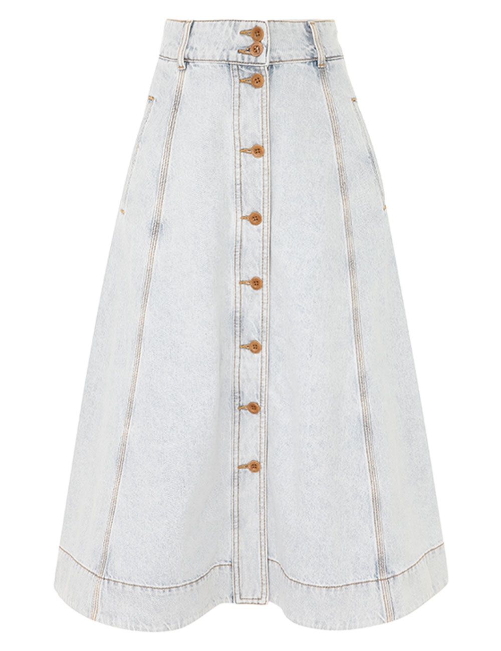 ITEM DETAILS The August A Line Denim Skirt in Storm Blue from our Resort Swim 2024 Collection. A denim midi skirt featuring a centre front placket with buttons and side pockets. - Denim skirt - Side front welt pocket - Buttons on waistband Style Code: 8529SRS242 SIZE DETAILS 0P 0 1 2 3 Length 72 78 78 78 78 Waist 66 68 74 76 84 Hip 102 106 112 116 122 Fitted at the waist This garment fits true to size Available in size 0P, suited to clients who are under 5'3"/ 160cm Model is 5'9.5"/178 cm, bust size 32C/10C and wears a size 0 Item measurements have been rounded to the nearest cm. CARE INSTRUCTIONS 100% cotton Exclusive of trims Gentle cold hand wash separately with mild detergent Do not bleach Do not soak, wring or rub Do not tumble dry Dry flat inside out, away from direct sunlight Cool iron on reverse Always check the garment care label for specific care instructions.