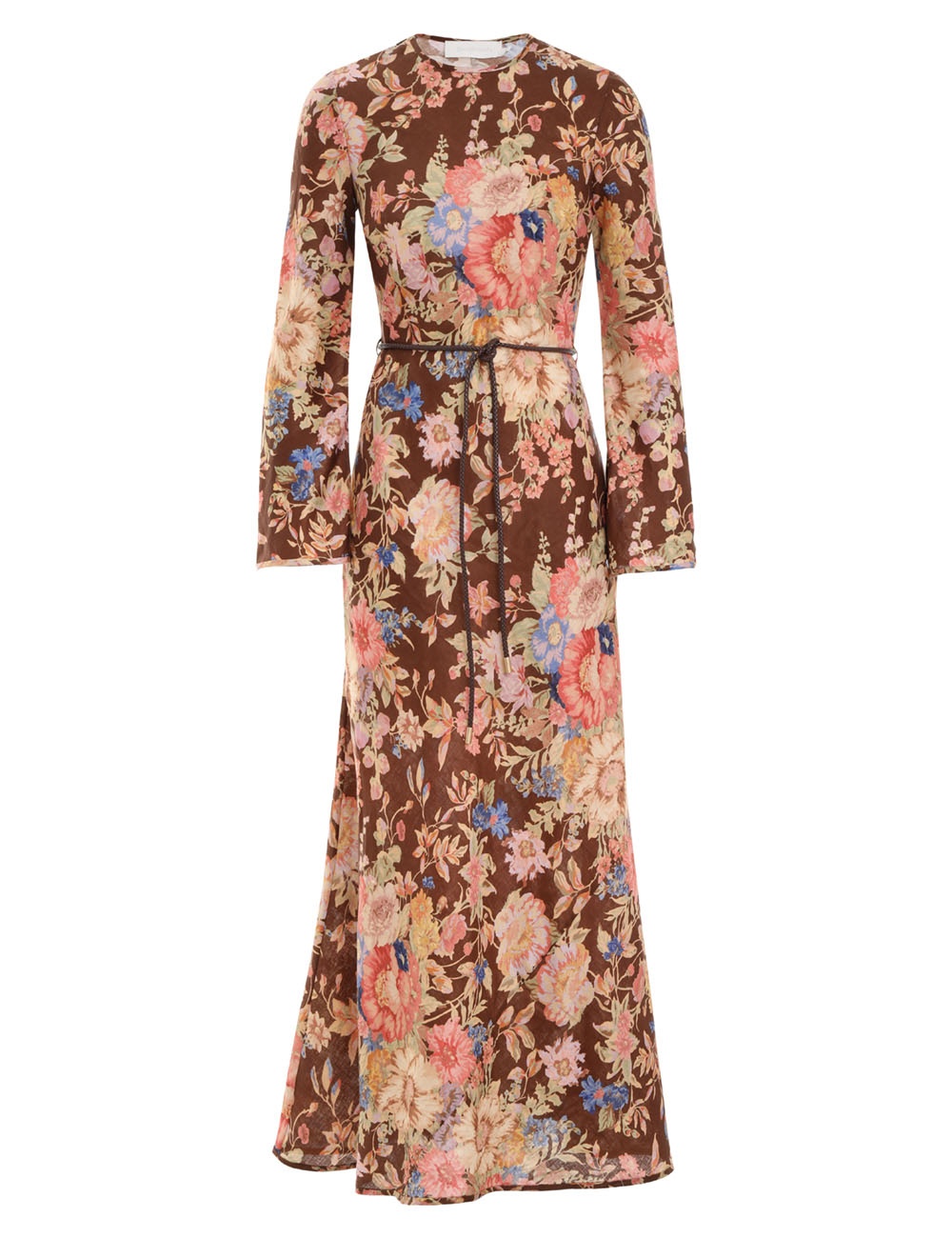 ITEM DETAILS The August Bias Long Dress in Chocolate Floral from our Resort Swim 2024 Collection. A linen midi dress cut on the bias with a removable belt. - Linen midi dress - Long bias sleeves - Zips on each shoulder - Side bust darts - Piping throughout Style Code: 8500DRS242 SIZE DETAILS 0P 0 1 2 3 4 Length 125 137 138 139 139 140 Bust 76 83 88 93 98 103 Waist 70 76 100 86 90 96 Sleeve 58 63 63 64 64 65 Slim fit This garment fits true to size Available in size 0P, suited to clients who are under 5'3"/ 160cm Model is 5'7.5"/175 cm, bust size 32C/10C and wears a size 0 Item measurements have been rounded to the nearest cm. CARE INSTRUCTIONS Main: 100% linen Contrast:100% cotton Exclusive of trims Remove belt before laundering Dry clean only code p Cool iron Do not spot clean Always check the garment care label for specific care instructions.