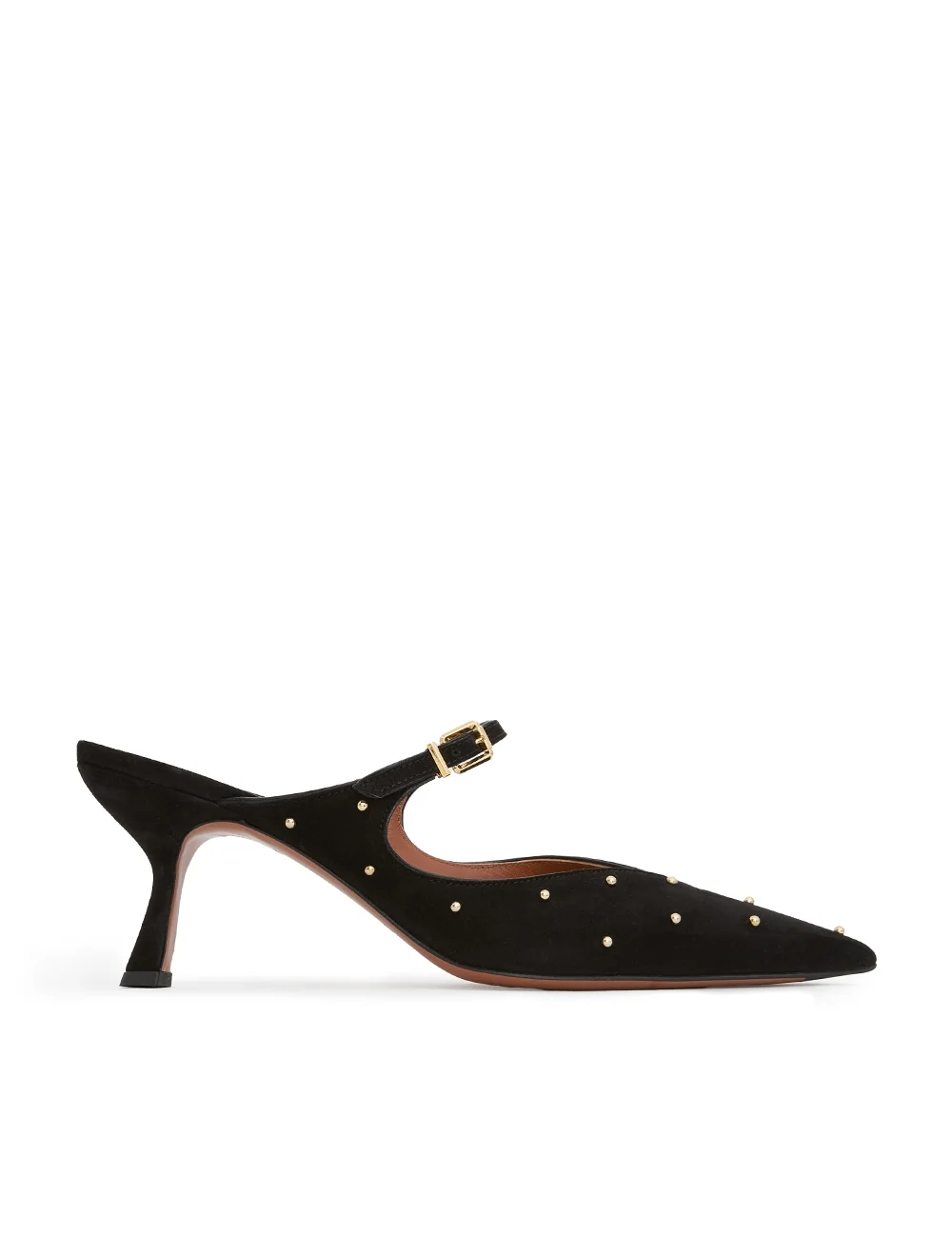 ITEM DETAILS The Aura Mule 65 in Black from our Cruise 2026 Collection, Twisted Romance. Aura adds effortless elegance to every occasion. - Suede mule with studs - Sweetheart silhouette - Pointed toe - Adjustable gold buckle hardware - Slim cross strap - 65mm stiletto heel - Made in Italy Style Code: 6338FC26A1 SIZE DETAILS This shoe fits true to size. CARE INSTRUCTIONS Upper: goat suede; lining: sheep leather; outsole: calf leather Suede care Handcrafted from genuine suede, this item may discolor or stain if exposed to humidity or atmospheric conditions Use a soft-bristled brush to remove soil and a stain repellent Avoid contact with light, heat, water, oils, perfume, and cosmetics Store in a dry environment in the original dust bag Always check the label or care card for specific care instructions.