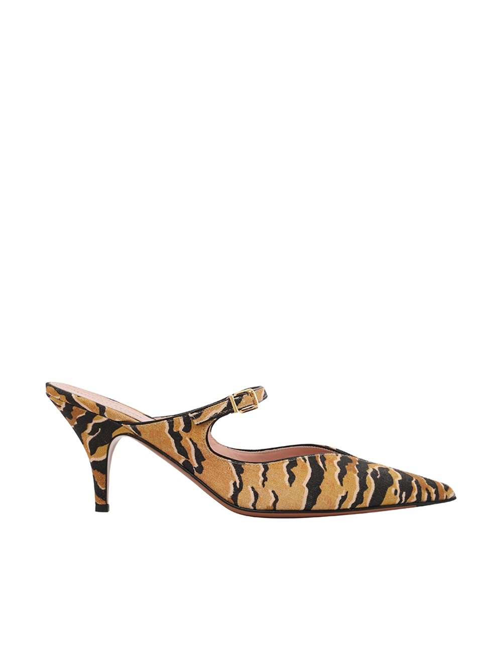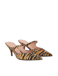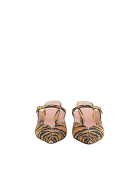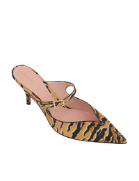 ITEM DETAILS The Aura Mule 65 in Tan Tiger from our Resort 2024 Collection, Matchmaker. A leather stiletto mule featuring a linen print throughout. - Leather mule - Pointed toe - God buckle hardware - 65mm stiletto heel - Made in Italy Style Code: 5147R24 SIZE DETAILS This shoe fits true to size. CARE INSTRUCTIONS Leather care: this item was handcrafted using genuine leather. Leather can alter or stain if in contact with humidity or atmospheric agents. Marks or irregularities in natural hides can appear in even the most luxurious skins. These are naturally occurring features and should not be thought of as imperfections. On occasion leather can stain clothing or other objects it comes into contact with. To maintain in best condition, avoid direct exposure to light and heat, water, oils, perfume and cosmetics and store at room temperature in original dust bag. Always check the garment care label for specific care instructions.