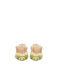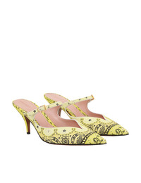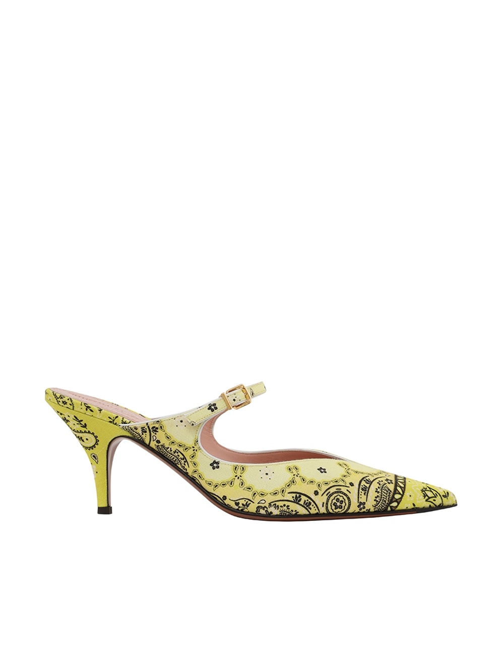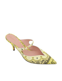 ITEM DETAILS The Aura Mule 65 in Yellow Bandana from our Resort 2024 Collection, Matchmaker. A leather stiletto mule featuring a linen print throughout. - Leather mule - Pointed toe - God buckle hardware - 65mm stiletto heel - Made in Italy Style Code: 5147R24 SIZE DETAILS This shoe fits true to size. CARE INSTRUCTIONS Leather care: this item was handcrafted using genuine leather. Leather can alter or stain if in contact with humidity or atmospheric agents. Marks or irregularities in natural hides can appear in even the most luxurious skins. These are naturally occurring features and should not be thought of as imperfections. On occasion leather can stain clothing or other objects it comes into contact with. To maintain in best condition, avoid direct exposure to light and heat, water, oils, perfume and cosmetics and store at room temperature in original dust bag. Always check the garment care label for specific care instructions.