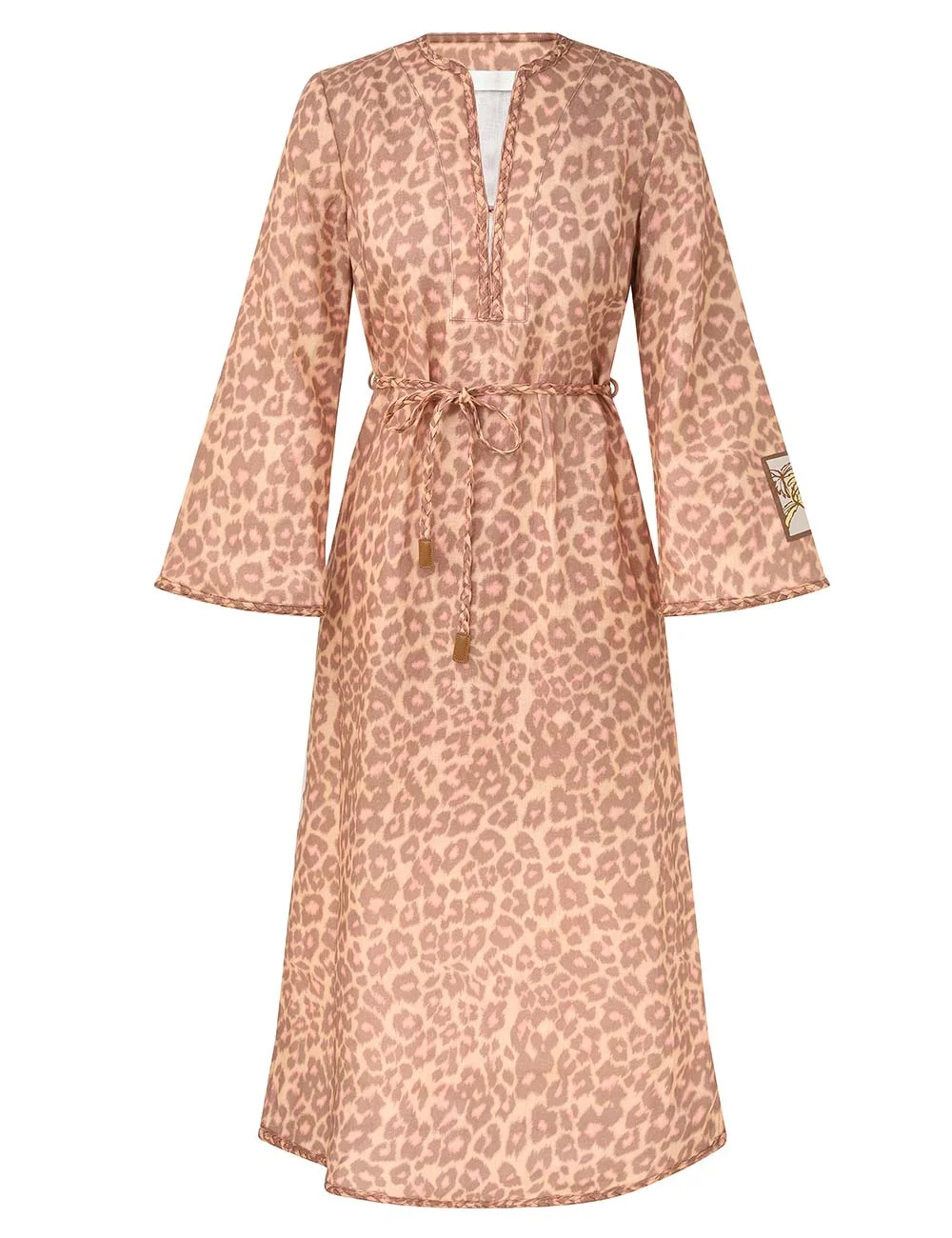 ITEM DETAILS The Awaken Braid Trim Midi in Tan Leopard from our Resort Swim 2026 Collection. A linen midi dress featuring a plunging V-neckline, long sleeves and partial side splits, finished with a removable waist belt. - Midi-length linen dress - Tunic silhouette - Self-tie braided belt - Side seam pockets - Long sleeves with wide cuffs - Braided trim detailing - Rouleau buttons across bust Style Code: 5824DRS261 SIZE DETAILS 0P 0 1 2 3 4 Length 46 49.5 50 50 50.5 51 Bust 35.5 37 39.5 41 43.5 45 Waist 36 38.5 40 42.5 44 46.5 Hip 40 42.5 44 46.5 48 50.5 Sleeve 20 21.5 22 22.5 22.5 23 Designed for a relaxed fit Mid-weight, non-stretchy fabric This garment fits true to size Available in size 0P, suited to clients who are under 5'3"/ 160cm Model is 5'9.5"/178 cm, bust size 32C/10C and wears a size 0 Item measurements are in inches CARE INSTRUCTIONS Main: 100% linen; pocketing: 100% cotton Dry clean only code f (hydrocarbon only); Remove any detachable trims prior to dry cleaning; Cover to protect trim; Iron in low temperature with protective cloth; Light steam only; Do not spot clean Always check the label or care card for specific care instructions.