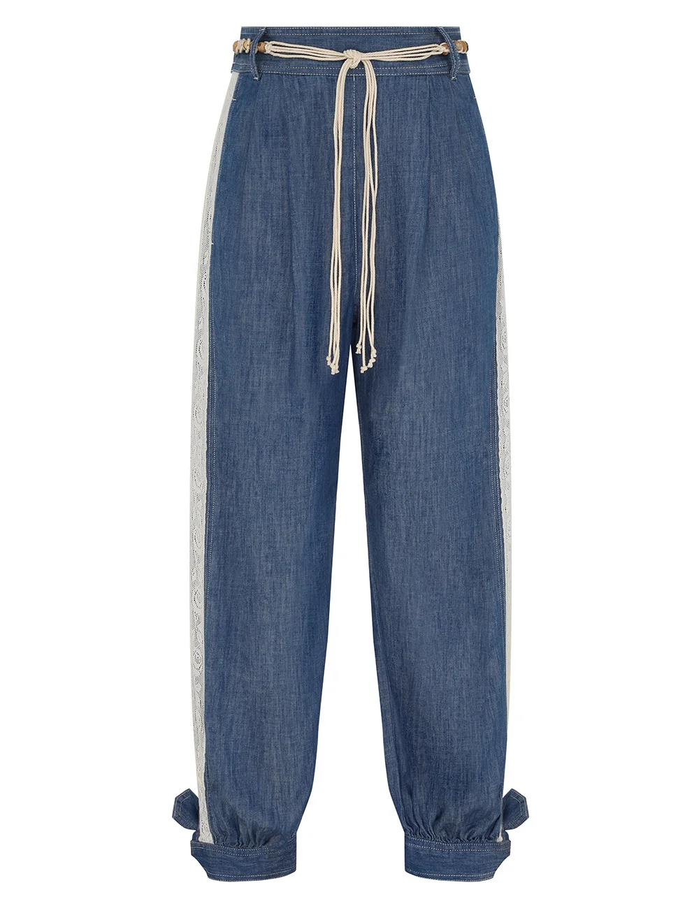 ITEM DETAILS The Awaken Denim Harem Pant in Railway Blue from our Resort Swim 2026 Collection. A denim harem pant featuring a shirred waistband at centre back, removable macrame waist belt, finished with lace panelling on the sides and bow-tie ankle cuffs. - Denim pant with high-rise waist - Rope trim belt with beads - Vertical lace panelling on sides - Functional side pockets - Gathered throughout - Adjustable ankle cuffs with ties Style Code: 5480PRS261 SIZE DETAILS 0P 0 1 2 3 4 Length 34 37 37.5 37.5 38 38 Waist 27 27.5 30 32.5 34 36 Hip 41.5 44 46.5 48 50.5 52 Inseam 25.5 28 28 28 28 28 Fitted at the waist and cuffs, relaxed throughout the legs High-rise waist with a full-length leg This garment fits true to size Available in size 0P, suited to clients who are under 5'3"/ 160cm Model is 5'9.5"/178 cm, bust size 32C/10C and wears a size 0 Item measurements are in inches CARE INSTRUCTIONS Main: 100% cotton; lace: 100% cotton; lace 2: 100% cotton Gentle cold hand wash separately with mild detergent Remove any detachable trims prior to washing Do not soak, rub or wring Do not bleach Do not tumble dry Dry in shade; Iron in low temperature with protective cloth Do not spot clean; Do not dry clean Always check the label or care card for specific care instructions.
