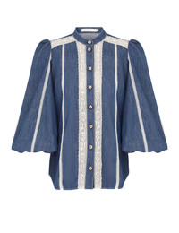 ITEM DETAILS The Awaken Denim Shirt in Railway Blue from our Resort Swim 2026 Collection. A denim shirt featuring long billow sleeves, stand collar with a single button closure, finished with lace panelling throughout. - Denim slim fit shirt - High neckline - Button-down front with floral crochet buttons - Gathered at sleeve head - Elasticated cuffs - Spliced lace detailing throughout Style Code: 5604TRS261 SIZE DETAILS 0P 0 1 2 3 4 Length 24.5 25.5 26 26.5 26.5 27 Bust 37 39.5 41.5 43.5 45.5 47 Waist 35.5 36 38.5 40 42.5 44 Sleeve 19.5 20.5 21 21 21.5 21.5 Slim fit Mid-weight, non-stretchy fabric This garment fits true to size Available in size 0P, suited to clients who are under 5'3"/ 160cm Model is 5'9.5"/178 cm, bust size 32C/10C and wears a size 0 Item measurements are in inches CARE INSTRUCTIONS Main: 100% cotton; lace: 100% cotton; lace 2: 100% cotton Gentle cold hand wash separately with mild detergent Remove any detachable trims prior to washing Do not soak, rub or wring Do not bleach Do not tumble dry Dry in shade; Iron in low temperature with protective cloth Do not spot clean; Do not dry clean Always check the label or care card for specific care instructions.