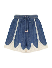 ITEM DETAILS The Awaken Denim Short in Railway Blue from our Resort Swim 2026 Collection. A denim short featuring an elasticated waistband, self-rouleau tie and lace detailing throughout. - Denim mid-rise short - Drawstring waist - Functional pockets - Vertical lace panelling and trim - Relaxed fit Style Code: 5631ARS261 SIZE DETAILS 0P 0 1 2 3 4 Length 11 12 12 12.5 12.5 13 Waist 35.5 37 39.5 41 43.5 45 Hip 45.5 48 50.5 52 54.5 56 Inseam 3.5 3.5 3.5 3.5 3.5 3.5 Elasticated waist for a flexible fit Mid-weight, non-stretchy fabric This garment fits true to size Available in size 0P, suited to clients who are under 5'3"/ 160cm Model is 5'9.5"/178 cm, bust size 32C/10C and wears a size 0 Item measurements are in inches CARE INSTRUCTIONS Main: 100% cotton; lace: 100% cotton; lace 2: 100% polyester Gentle cold hand wash separately with mild detergent Remove any detachable trims prior to washing Do not soak, rub or wring Do not bleach Do not tumble dry Dry in shade; Iron in low temperature with protective cloth Do not spot clean; Do not dry clean Always check the label or care card for specific care instructions.