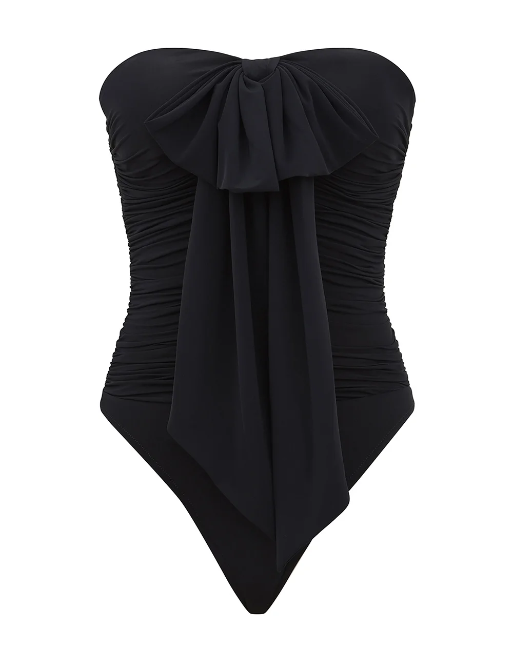 ITEM DETAILS The Awaken Drape Bow 1PC in Black from our Resort Swim 2026 Collection. A shiny one piece featuring a draped bodice and dramatic bow detail at bust. - One piece with shiny finish - Gripper elastic at neckline - Side seam boning - Ruching throughout - Removable and adjustable straps for versatile fit - Removable soft cups - Medium bottom coverage - Lined Style Code: 9175WRS261 SIZE DETAILS This garment fits true to size Model is 5'10.5"/179 cm, bust size 34C/12C and wears a size 0 CARE INSTRUCTIONS Main: 88% polyester, 12% elastane; lining: 92% recycled nylon, 8% elastane Do not roll up when wet; Rinse immediately after use; Remove any detachable trims prior to washing; Cold hand wash separately with mild detergent, avoid fabric softener; Dry in shade; Do not bleach or iron; Do not tumble dry; Do not dry clean; Light colours may be transparent when wet; Avoid contact with sunscreens, oils, rough surfaces, and high temperature pools and spas; Always check the label or care card for specific care instructions.