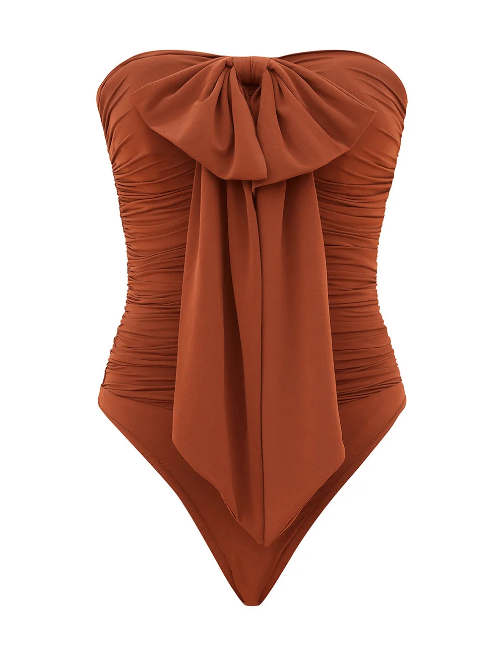 ITEM DETAILS The Awaken Drape Bow 1PC in Bronze from our Resort Swim 2026 Collection. A shiny one piece featuring a draped bodice and dramatic bow detail at bust. - One piece with shiny finish - Gripper elastic at neckline - Side seam boning - Ruching throughout - Removable and adjustable straps for versatile fit - Removable soft cups - Medium bottom coverage - Lined Style Code: 9175WRS261 SIZE DETAILS This garment fits true to size Model is 5'10.5"/179 cm, bust size 34C/12C and wears a size 0 CARE INSTRUCTIONS Main: 88% polyester, 12% elastane; lining: 92% recycled nylon, 8% elastane Do not roll up when wet; Rinse immediately after use; Remove any detachable trims prior to washing; Cold hand wash separately with mild detergent, avoid fabric softener; Dry in shade; Do not bleach or iron; Do not tumble dry; Do not dry clean; Light colours may be transparent when wet; Avoid contact with sunscreens, oils, rough surfaces, and high temperature pools and spas; Always check the label or care card for specific care instructions.