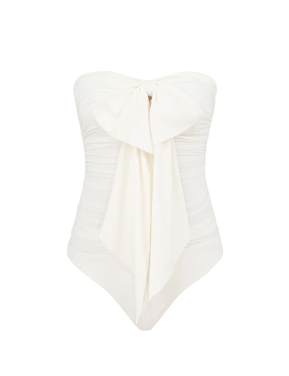 ITEM DETAILS The Awaken Drape Bow 1PC in Ivory from our Resort Swim 2026 Collection. A shiny lycra one piece featuring a draped bodice and dramatic bow detail at bust. - Lycra one piece with shiny finish - Gripper elastic at neckline - Side seam boning - Ruching throughout - Removable and adjustable straps for versatile fit - Medium bottom coverage - Lined Style Code: 9175WRS261 SIZE DETAILS This garment fits true to size Model is 5'10.5"/179 cm, bust size 34C/12C and wears a size 0 CARE INSTRUCTIONS Main: 88% polyester, 12% elastane; lining: 92% recycled nylon, 8% elastane Do not roll up when wet; Rinse immediately after use; Remove any detachable trims prior to washing; Cold hand wash separately with mild detergent, avoid fabric softener; Dry in shade; Do not bleach or iron; Do not tumble dry; Do not dry clean; Light colours may be transparent when wet; Avoid contact with sunscreens, oils, rough surfaces, and high temperature pools and spas; Always check the label or care card for specific care instructions.