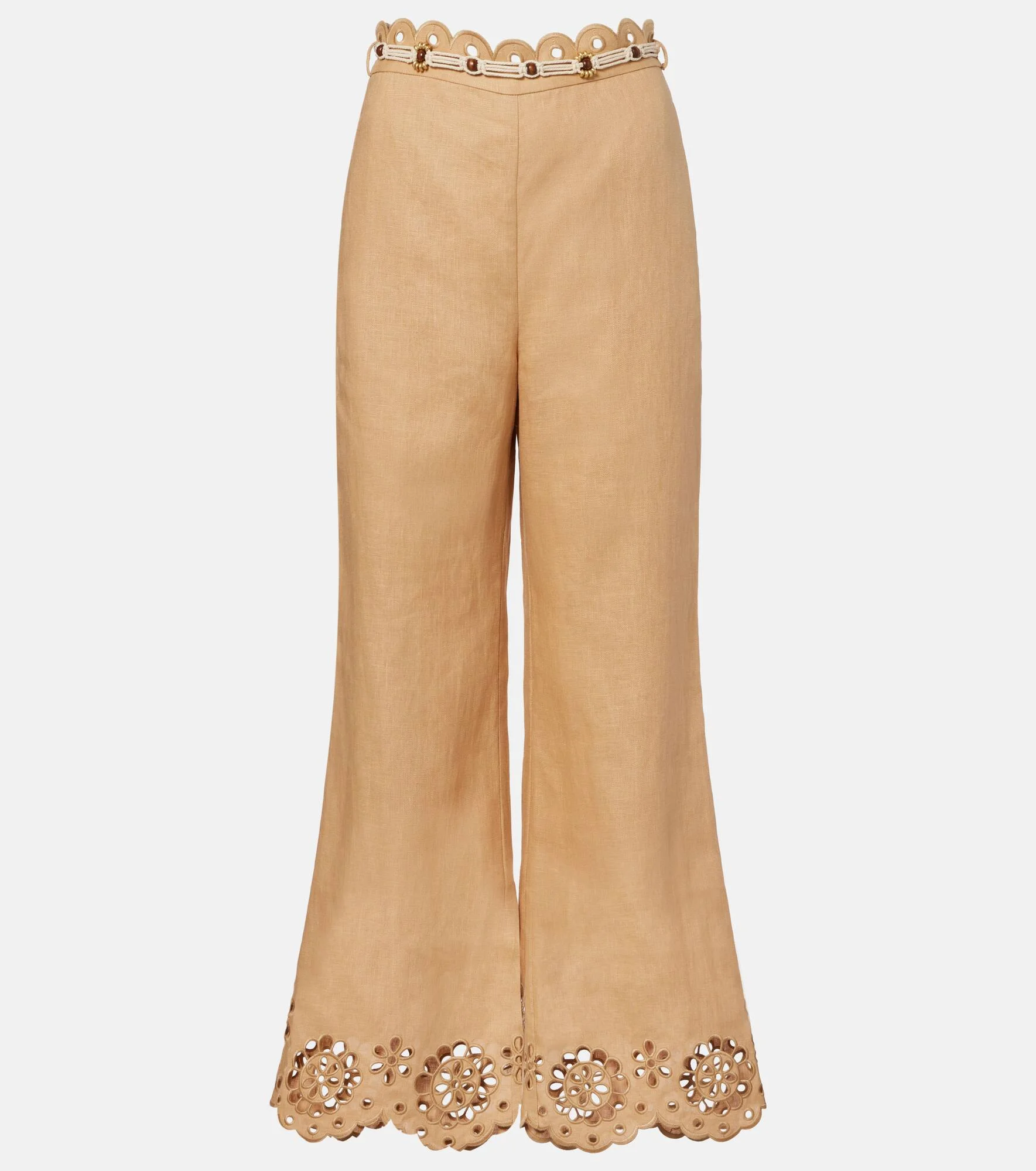 Ethereal and romantic barely scratch the surface when describing a Zimmermann piece. These Awaken pants are cut from linen to a flared and cropped silhouette, showcasing broderie anglaise detailing at the hems and a belted, scalloped waist. Product Details - Material: 100% linen - Care instructions: dry clean - Made in China - Color: beige - Designer color name: Straw - Item color: beige - Embroidery: 100% polyester - Pocket lining: 100% cotton - Closure: concealed zipped back - Detachable belt - Pockets: side slit pockets, back pockets - Hem: scalloped - Item number: P01129815 Size & Fit - True to size - Non-stretchy fabric - Flared - The model seen in the picture is 178cm-5'10" and wearing a size 0