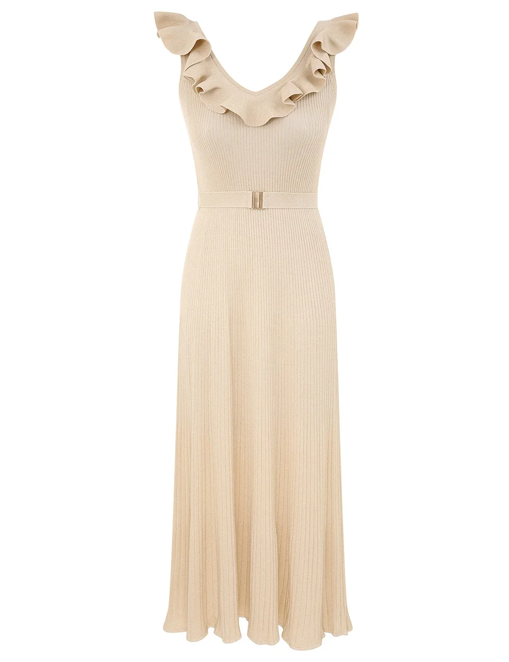 ITEM DETAILS The Awaken Metallic Midi Dress in Metallic Gold from our Resort Swim 2026 Collection. A knit midi dress featuring a plunging V-neckline with frill overlay, waist belt and a pleated skirt. - Sleeveless, midi-length dress - Frill trim across bust and upper back - Removable belt with gold hardware - Gathered skirt Style Code: 6605DRS261 SIZE DETAILS 0P 0 1 2 3 4 Length 43.5 48 48.5 49 49 49 Bust 18 19.5 22 24.5 26 28.5 Waist 22 23.5 26 28.5 30 32.5 Hip 41 43.5 45.5 47 49.5 51 Designed for a regular fit Mid-weight, stretchy knitted fabric This garment fits true to size Available in size 0P, suited to clients who are under 5'3"/ 160cm Model is 5'9.5"/178 cm, bust size 32C/10C and wears a size 0 Item measurements are in inches CARE INSTRUCTIONS 100% viscose Dry clean only code f (hydrocarbon only) Remove any detachable trims prior to dry cleaning Cover to protect trim Iron in low temperature with protective cloth Do not spot clean Store garment flat do not hang Always check the label or care card for specific care instructions.