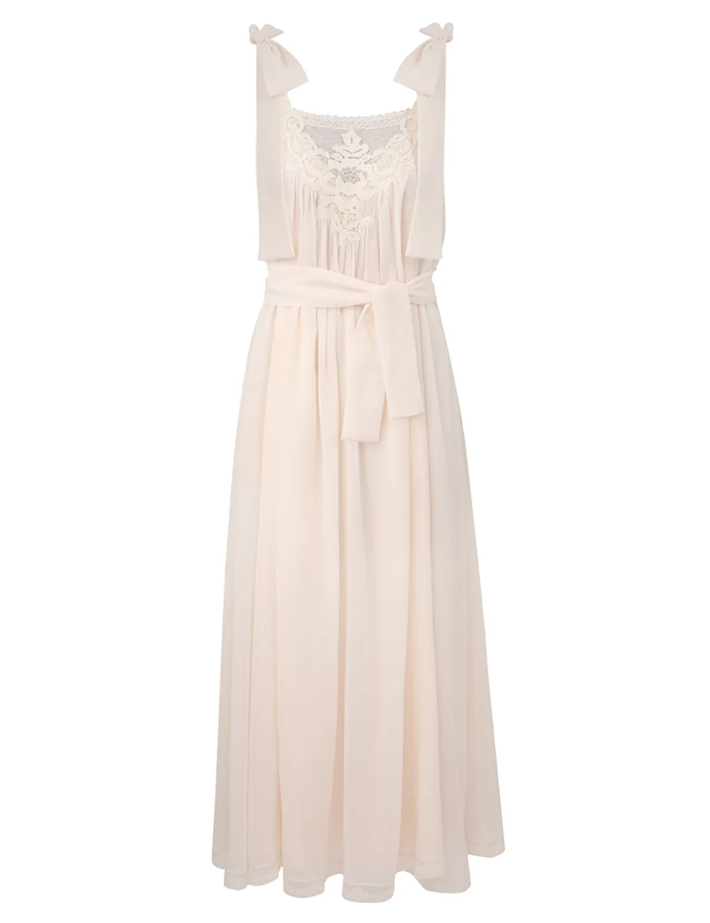 ITEM DETAILS The Awaken Slip Dress in Cream from our Resort Swim 2026 Collection. A cotton-silk blend dress featuring a square neckline, self-tie straps, finished with a removable waist belt and heavy gathering throughout. - Cotton-silk blend fabric - Sleeveless maxi dress - Wide bow-tie straps - Lace trim at the bust and hem - Lined Style Code: 5587DRS261 SIZE DETAILS 0P 0 1 2 3 4 Length 40 43.5 43.5 43.5 43.5 43.5 Bust 32.5 34.5 37 38.5 41 42.5 Designed for a relaxed fit Light-weight, non-stretchy fabric This garment fits true to size Available in size 0P, suited to clients who are under 5'3"/ 160cm Model is 5'9.5"/178 cm, bust size 32C/10C and wears a size 0 Item measurements are in inches CARE INSTRUCTIONS Main: 77% cotton, 23% silk; contrast: 100% polyester; lining: 100% viscose; lace: 100% polyester; lace 2: 100% cotton Dry clean only code f (hydrocarbon only); Remove any detachable trims prior to dry cleaning; Cover to protect trim; Iron in low temperature with protective cloth; Light steam only; Do not spot clean Always check the label or care card for specific care instructions.