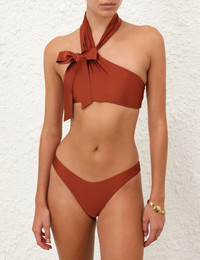 ITEM DETAILS The Awaken Tie Neck Bikini in Terracotta from our Resort Swim 2026 Collection. A shiny lycra bikini set featuring an off-the-shoulder bikini top with front tie detailing and matching skinny pant. - Lycra bikini set with shiny finish - Halter bikini top - Right side bow tie gathered into knot - Signature back clasp closure - Classic scoop pant - Brief coverage - Lined Style Code: 5511WRS261 SIZE DETAILS This garment fits true to size Model is 5'10.5"/179 cm, bust size 34C/12C and wears a size 0 CARE INSTRUCTIONS Main: 80% polyamide, 20% elastane; lining: 92% recycled nylon, 8% elastane Do not roll up when wet; Rinse immediately after use; Remove any detachable trims prior to washing; Cold hand wash separately with mild detergent, avoid fabric softener; Dry in shade; Do not bleach or iron; Do not tumble dry; Do not dry clean; Light colours may be transparent when wet; Avoid contact with sunscreens, oils, rough surfaces, and high temperature pools and spas; Always check the label or care card for specific care instructions.