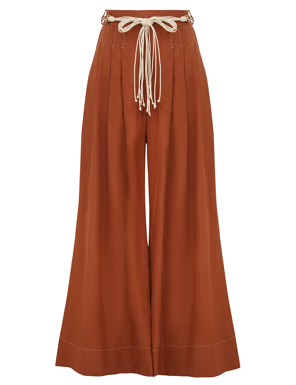 ITEM DETAILS The Awaken Wide Leg Pant in Cinnamon from our Resort Swim 2026 Collection. A linen pant featuring a mid-rise waistband, pintucks through the centre front legs, finished with a flared silhouette. - Full-length linen pant - Elasticated waistband at the back - Removable rope belt - Flared hem - Functional side pockets - Partially lined Style Code: 5612PRS261 SIZE DETAILS 0P 0 1 2 3 4 Length 38 41.5 41.5 41.5 42 77.5 Waist 25 26 28.5 30.5 32.5 34.5 Hip 36 38.5 41 41.5 45 46.5 Inseam 28.5 30.5 30.5 30.5 30.5 30.5 Partially elasticated waistband for a flexible fit Light-weight, non-stretchy fabric Mid-rise waist with a full-length leg This garment fits true to size Available in size 0P, suited to clients who are under 5'3"/ 160cm Model is 5'9.5"/178 cm, bust size 32C/10C and wears a size 0 Item measurements are in inches CARE INSTRUCTIONS Main: 100% linen; lining: 100% cotton Dry clean only code f (hydrocarbon only); Remove any detachable trims prior to dry cleaning; Cover to protect trim; Iron in low temperature with protective cloth; Light steam only; Do not spot clean Always check the label or care card for specific care instructions.