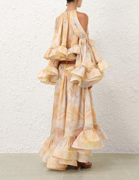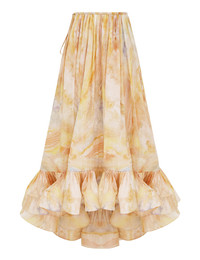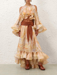 ITEM DETAILS The Balance Flounce Maxi Skirt in Honey Agate from our Spring 2025 Collection, Illumination. A maxi skirt featuring a high-low hemline with statement ruffle details, finished with a gathered waistband with adjustable drawstring ties. - Ruffle maxi skirt - Gathered waist with drawstring closure - Statement ruffle details - Invisible zip at centre back Runway: This style was featured on the S25 Runway. Style Code: 4417SS253 SIZE DETAILS 0P 0 1 2 3 4 Length 40.5 44 44 44 44 44 Waist 25 27 28.5 30.5 32.5 34.5 Adjustable waist This garment fits true to size Available in size 0P, suited to clients who are under 5'3"/ 160cm Model is 5'9.5"/178 cm, bust size 32C/10C and wears a size 0 Item measurements are in inches CARE INSTRUCTIONS Main: 100% silk Dry clean only code f (hydrocarbon only); Remove any detachable trims prior to dry cleaning; Cover to protect trim; Do not iron; Light steam; Do not spot clean Always check the label or care card for specific care instructions.