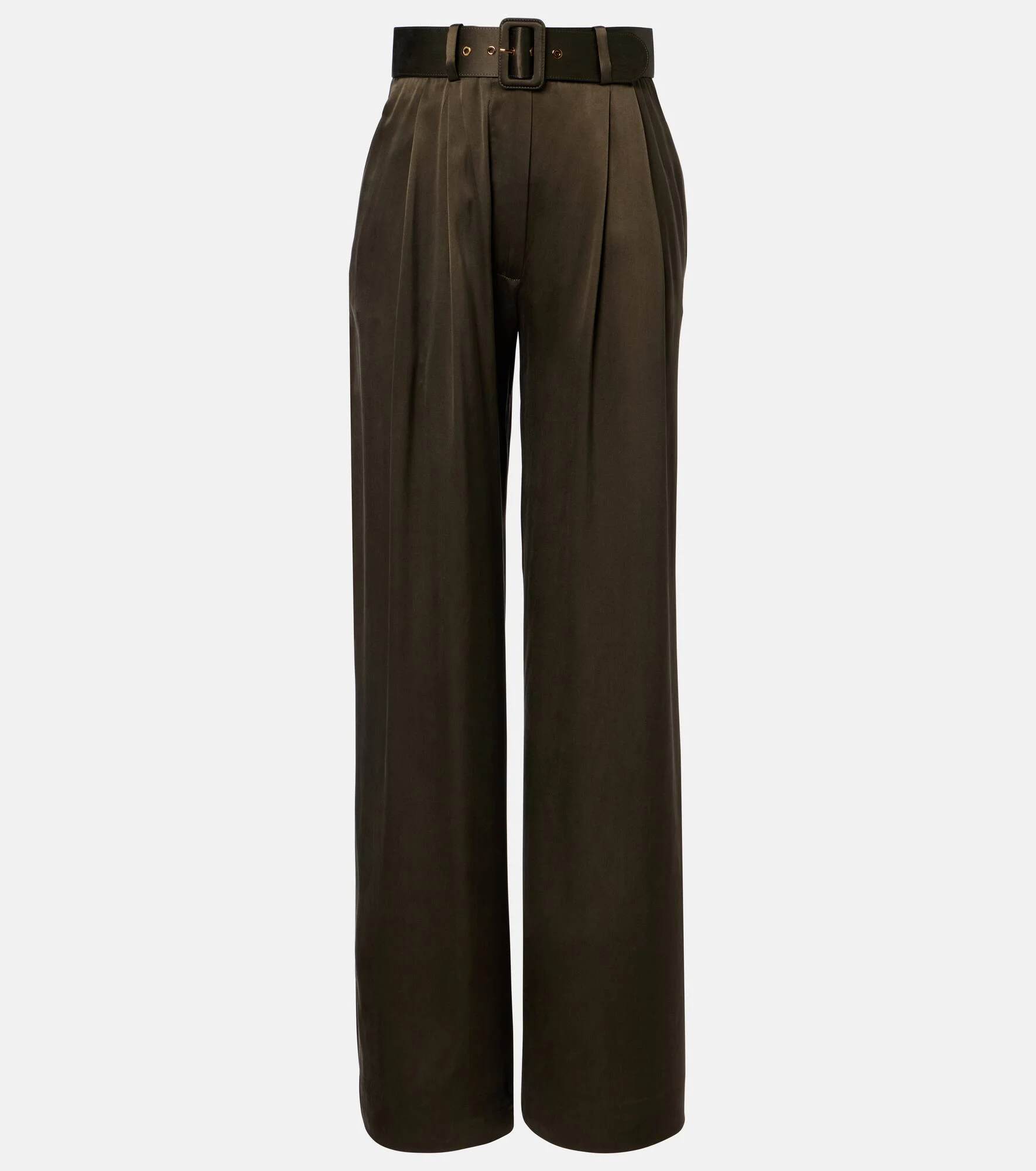 These pants from Zimmermann are crafted from fluid silk, showcasing a wide-leg construction. The relaxed silhouette is accentuated by pleated details at the front and a matching, detachable belt. Product Details - Material: 100% silk - Care instructions: dry clean - Made in China - Color: green - Designer color name: Dark Olive - Belt loops - Detachable belt - Closure: zipper fly, button and hook fastenings - Pockets: side slit pockets - Item number: P01154299 Size & Fit - True to size - Adjustable at the waist - Non-stretchy fabric - Wide-leg - The model seen in the picture is 178cm-5'10" and wearing a size 0