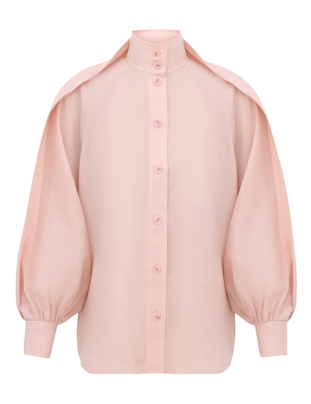 ITEM DETAILS The Billow Blouse in Light Pink from our Spring 2026 Collection, Kindred Spirit. A ramie blouse featuring a high stand collar, long raglan sleeves gathered into fitted cuffs, finished with centre front buttons. - 100% ramie fabric - High stand collar with double button closure - Centre front buttons - Gathered sleeves with draped cape overlay - Fitted, buttoned cuffs - Asymmetric hem Style Code: 8180TS26R SIZE DETAILS 0P 0 1 2 3 4 Length 25 27 27 27 27.5 27.5 Bust 38.5 40 42.5 44 46.5 49 Waist 39.5 41.5 43.5 45.5 47 49.5 Sleeve 27 28.5 29 29.5 30 30.5 Fitted at the collar and cuffs, relaxed through the body Light-weight, non-stretchy fabric This garment fits true to size Available in size 0P, suited to clients who are under 5'3"/ 160cm Model is 5'9.5"/178 cm, bust size 32C/10C and wears a size 0 Item measurements are in inches CARE INSTRUCTIONS Main: 100% ramie Dry clean only code f (hydrocarbon only); Remove any detachable trims prior to dry cleaning; Cover to protect trim; Iron in low temperature with protective cloth; Light steam only; Do not spot clean Always check the label or care card for specific care instructions.