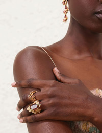 ITEM DETAILS The Bloom Cocktail Ring in Gold/Burgundy from our Cruise 2026 Collection, Twisted Romance. A gold plated ring featuring a burgundy stone set in an intricate cast setting. - 12KT gold plated brass - Glass cabochon and cubic zirconia stones - Intricate rope textured brass settings - Available in three sizes Style Code: 5470XC26A1 SIZE DETAILS Ring diameter: Size 13: 17mm Size 15: 18mm Size 18: 19mm CARE INSTRUCTIONS Stone: glass; stone 2: cubic zirconia; hardware:12 karat gold plated brass; Zimmermann jewellery is made from 12kt gold-plated brass Please remove during exercising, showering or swimming Avoid contact with perfumes, acetones, creams, and water to prevent damage or discoloration Clean gently with a soft, lint-free cloth. Avoid cleaning products Store in a cool, dry place, away from direct sunlight and heat Always check the label or care card for specific care instructions.