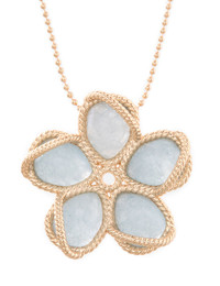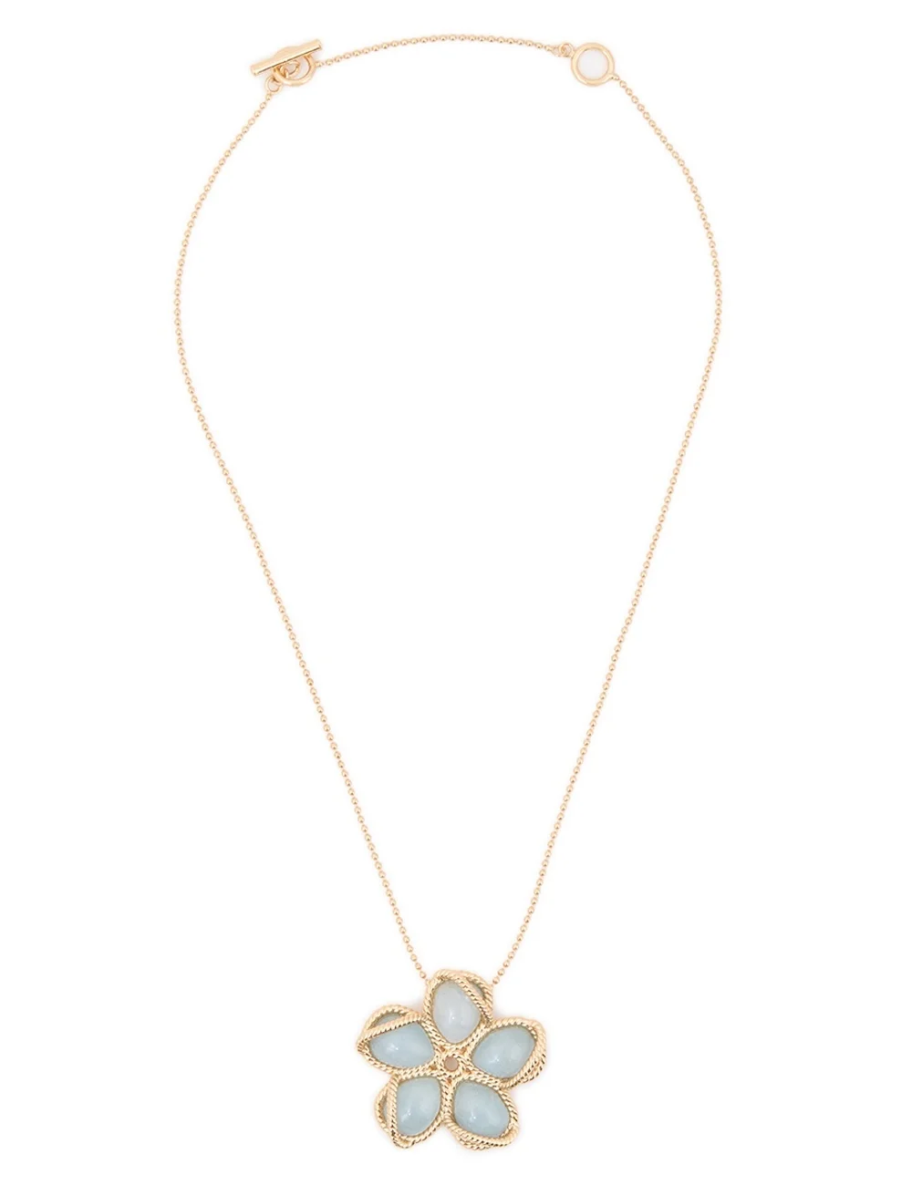ITEM DETAILS The Bloom Pendant in Gold/Aqua from our Spring 2025 Collection, Illumination. A gold plated chain necklace featuring natural Jade stones set in a floral design. - 12KT gold plated brass - Natural Jade stones - T-bar clasp - Adjustable chain length Style Code: 3539XS25A1 SIZE DETAILS One size. CARE INSTRUCTIONS 50% brass 50% jade Our semi-precious stones are hand-cut to enhance their natural beauty, with unique variations in each piece Zimmermann jewellery is made from 12kt gold-plated brass Please remove during exercise, showering, or swimming Keep away from perfumes, acetones, creams, and water to prevent damage or discoloration Clean gently with a soft, lint-free clothavoid cleaning products Store in a cool, dry place, away from direct sunlight and heat Always check the label or care card for specific care instructions.
