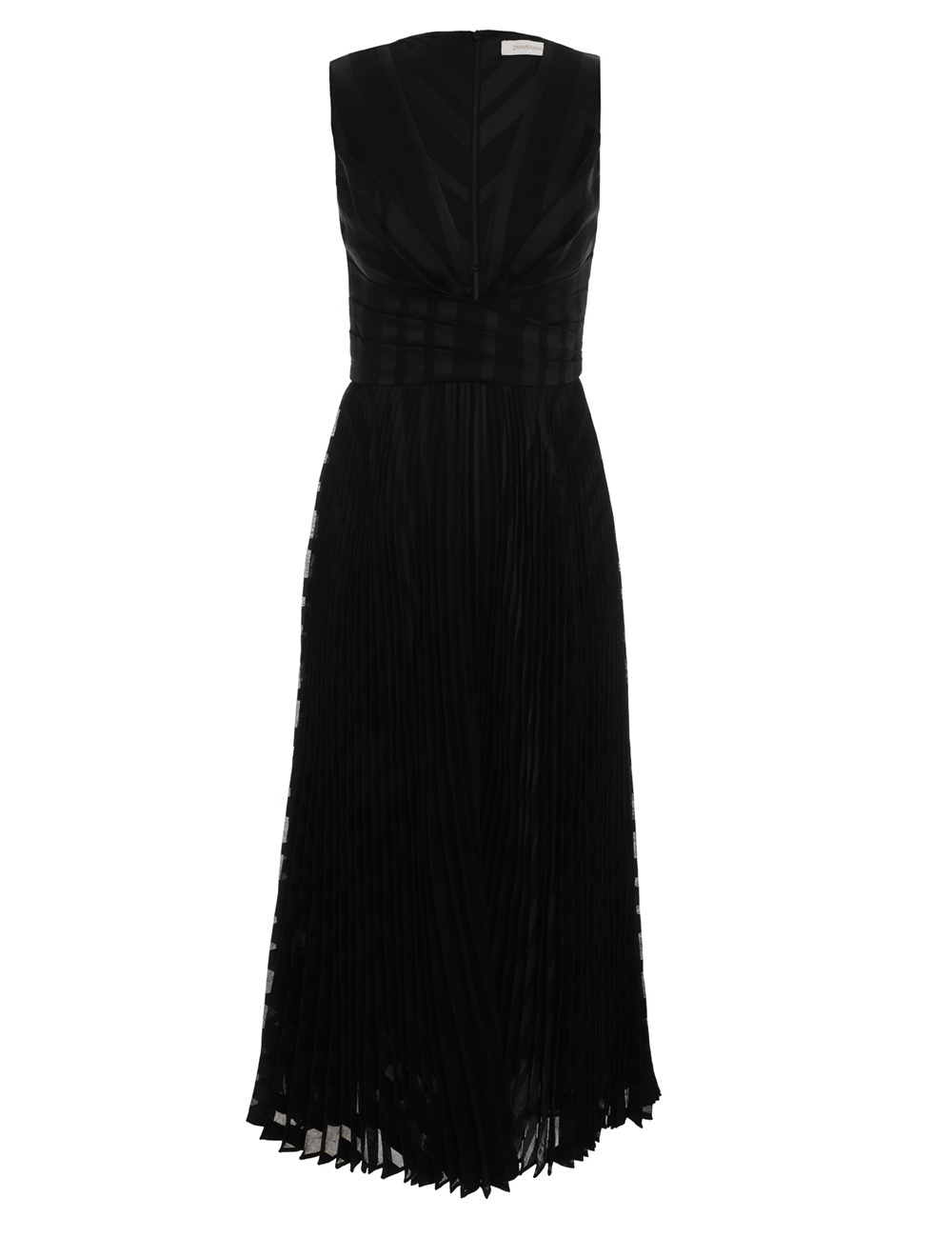 ITEM DETAILS The Burnout Sunray Midi in Black from our Spring 2023 Collection, Wonderland. A midi dress featuring a fitted bodice and gathered waist, with sunray pleats throughout. - Sunray pleated midi dress - Fitted empire bust - Voluminous full skirt - Boning in side seams - Invisible zip closure at centre back - Lined Style Code: 6899DRWON STYLING Style the Burnout Sunray Midi with the Small Cross Body Bag and Embellished Sandal 85 for your next special occasion. SIZE DETAILS 0P 0 1 2 3 4 Length 118 118 129 130 130 131 Bust 82 88 92 98 102 108 Waist 64 66 72 78 82 86 This garment fits true to size, we recommend you select your normal size. Fitted through the bust and bodice. Available in size 0P, specially designed with petite proportions that are suited to clients who are under 5'3""/ 160cm. Our model is 5'9.5"" / 178 cm, bust size 32C/10C and is wearing a size 0. CARE INSTRUCTIONS Main: 100% polyester Exclusive of trims Dry clean only code p with protective bag Cool iron on reverse Do not spot clean Light steam only Always check the garment care label for specific care instructions.