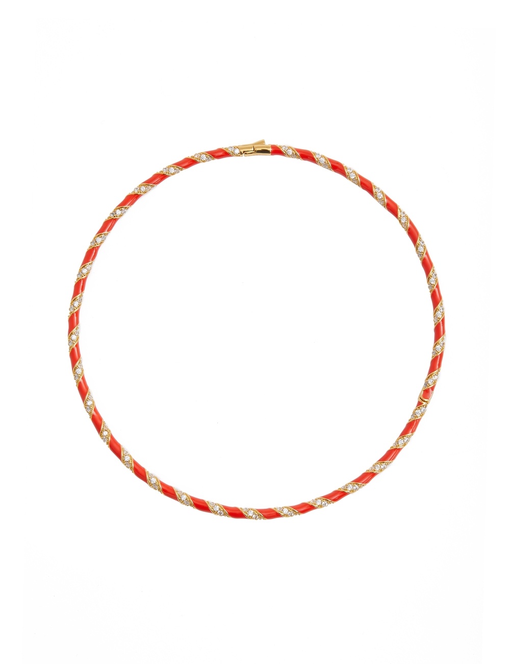 ITEM DETAILS The Candy Stripe Pave Choker in Gold/Red from our Spring 2023 Collection, Wonderland. A gold plated choker featuring cubic zirconia stones throughout. - 20k gold plated - Coloured enamel finishing - Channel set white cubic zirconia - Custom hinge closure Style Code: 4705S23 SIZE DETAILS One size fits all. CARE INSTRUCTIONS Zimmermann jewellery is produced in 20kt gold-plated brass. Please remove when exercising, showering or swimming. Keep enamel away from perfumes, acetones, hand and body creams and water as they may cause damage or discolouring. Clean your enamel jewellery pieces with warm water, a mild liquid soap and a soft cloth. Store in a cool, dry place to prevent damage. Keep away from direct sunlight and heat. Always check the garment care label for specific care instructions.