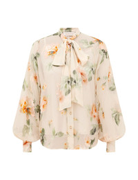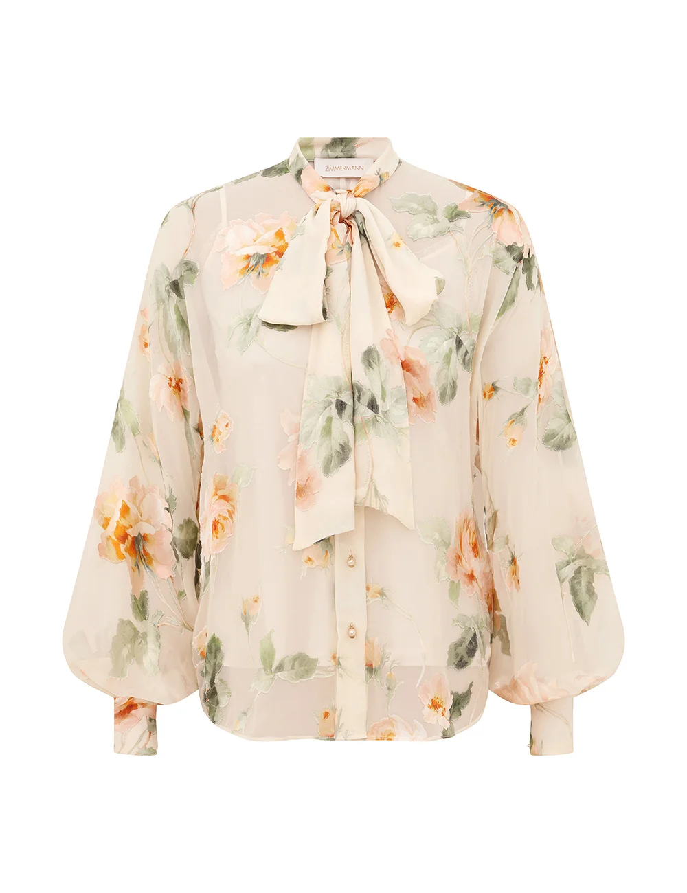 ITEM DETAILS The Carousel Burnout Blouse in Cream Rose from our Spring 2026 Collection, Kindred Spirit. A blouse featuring stand collar with pussybow necktie, billow sleeves, finished with fitted cuffs and centre front buttons. - Long sleeve blouse - Self-tie necktie - Sleeves gathered into fitted cuffs - Centre front pearls buttons - Comes with a separate slip Style Code: 8171TS263 SIZE DETAILS 0P 0 1 2 3 4 Length 25 26.5 27 27 27 27.5 Waist 43.5 45.5 47 49.5 51 53.5 Sleeve 25.5 27 27.5 28 28.5 28.5 Relaxed fit This garment fits true to size Available in size 0P, suited to clients who are under 5'3"/ 160cm Model is 5'9.5"/178 cm, bust size 32C/10C and wears a size 0 Item measurements are in inches CARE INSTRUCTIONS Non burnout: 76% viscose, 24% silk; burnout: 100% silk; slip: 100% viscose Main: Dry clean only code f (hydrocarbon only); Remove any detachable trims prior to dry cleaning; Cover to protect trim; Iron in low temperature with protective cloth; Light steam only; Do not spot clean Slip: Gentle cold hand wash separately with mild detergent; Do not bleach; Dry in shade; Iron in low temperature with protective cloth; Do not tumble dry; Dry cleanable code f (hydrocarbon only); Always check the label or care card for specific care instructions.