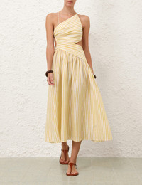 ITEM DETAILS The Cascadian Asymmetric Dress in Yellow Stripe from our Summer Swim 2025 Collection. A midi dress featuring a one-shoulder silhouette, exposed sides and criss-cross ties at the back. - 100% linen fabric - Asymmetrical neckline - Exposed sides and back with rouleau straps - Invisible zip closure at left hand side - Pleat drop skirt with gathering - Contrasting stripes throughout Style Code: 4565DSS255 SIZE DETAILS 0P 0 1 2 3 4 Length 30.5 33.5 33.5 33.5 33.5 Bust 38 40 41.5 44 45.5 Waist 26 27.5 30 31.5 33 Designed to be slightly fitted at the bust and waist, loose at the hip This garment fits true to size Available in size 0P, suited to clients who are under 5'3"/ 160cm Model is 5'9.5"/178 cm, bust size 32C/10C and wears a size 0 Item measurements are in inches CARE INSTRUCTIONS Main: 100% linen; lining: 100% cotton Dry clean only code f (hydrocarbon only); Remove any detachable trims prior to dry cleaning; Cover to protect trim; Cool iron with protective cloth; Light steam only; Do not spot clean Always check the label or care card for specific care instructions.