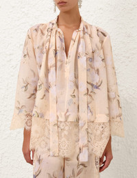 ITEM DETAILS The Cascadian Lace Tie Neck Blouse in Cream Botanical Floral from our Summer Swim 2025 Collection. A ramie blouse featuring long raglan sleeves and self-rouleau tie at neck, finished with a contrasting lace trim. - 100% ramie fabric - Adjustable collar with a self-tie neck for a customised fit - Heavy gathering at the shoulders - Rouleau loops with invisible buttons at centre front - Lace overlay with scalloped edging at cuffs and hem Style Code: 3491TSS255 SIZE DETAILS 0P 0 1 2 3 Length 27 28.5 28.5 28.5 29 Sleeve 20.5 22 22.5 22.5 23 Designed for a relaxed fit This garment fits true to size Available in size 0P, suited to clients who are under 5'3"/ 160cm Model is 5'9.5"/178 cm, bust size 32C/10C and wears a size 0 Item measurements are in inches CARE INSTRUCTIONS Main: 100% ramie; trim: 69. 9% cotton, 30. 1% nylon Dry clean only code f (hydrocarbon only); Remove any detachable trims prior to dry cleaning; Cover to protect trim; Cool iron with protective cloth; Light steam only; Do not spot clean Always check the label or care card for specific care instructions.