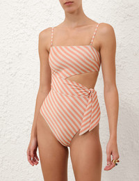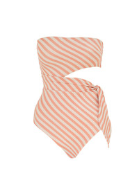 ITEM DETAILS The Cascadian Scarf Tie 1PC in Pink and Cream Stripe from our Summer Swim 2025 Collection. A metallic lycra one piece swimsuit featuring removable straps, side cut-out and tie detail at the hip. - One piece swimsuit with contrasting stripes - Detachable, adjustable straps for versatile fit - Square neckline - Opening at front left waist with scarf tie detail - Medium bottom coverage - Lined Campaign: This style was featured in the Summer Swim 2025 Campaign. Style Code: 4645WSS255 SIZE DETAILS This garment is a smaller fit, we recommend sizing up Model is 5'10.5"/179 cm, bust size 34C/12C and wears a size 0 CARE INSTRUCTIONS Main: 64% recycled polyester, 16% metallic, 12% polyamide, 8% elastane; lining: 92% recycled nylon, 8% spandex Do not roll up when wet; Rinse thoroughly after use; Remove any detachable trims prior to washing; Cold hand wash separately with mild detergent, avoid fabric softener; Dry in shade; Do not bleach or iron; Do not tumble dry; Do not dry clean; Light colours may be transparent when wet; Avoid contact with sunscreens, oils and rough surfaces; Avoid high temperature pools and spas treated with harsh chemicals Always check the label or care card for specific care instructions.