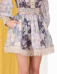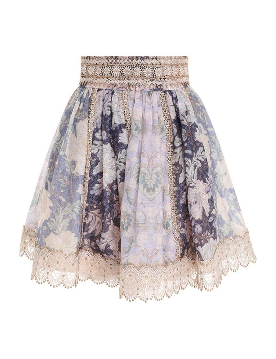 ITEM DETAILS The Celestial Lace Panelled Skirt in Spliced Lavender Floral from our Fall 2022 Collection, Stargazer. A silk linen mini skirt featuring contrast gold daisy and doily trims, a crinoline hem and a spliced print throughout. - Silk linen mini skirt - High waisted - Contrast gold trims - Crinoline hem - Zip closure at centre back Style Code: 4496SCEL STYLING Style the Celestial Lace Panelled Skirt with the Celestial Spliced Blouse, Crescent Chain Sandal and Hoop and Star Earring for your next event with friends. Wear this style with the Crescent Chain Sandal, Hoop and Star Earrings and Celestial Spliced Blouse by ZIMMERMANN SIZE DETAILS 0P 0 1 2 3 4 Length 41 43 43 44 45 46 Waist 66 68 74 80 84 90 This garment fits true to size, we recommend you select your normal size. Fixed waist, relaxed through skirt. Available in size 0P, specially designed with petite proportions that are suited to clients who are under 5'3"/ 160cm. Our model is 5'9.5" / 178 cm, bust size 32C/10C and is wearing a size 0. CARE INSTRUCTIONS Main: 51% linen 49% silk Lining: 100% cotton Exclusive of trims Dry clean only code f with protective bag Cool iron with protective cloth Light steam only Do not spot clean Turn garment inside out before dry cleaning Always check the garment care label for specific care instructions