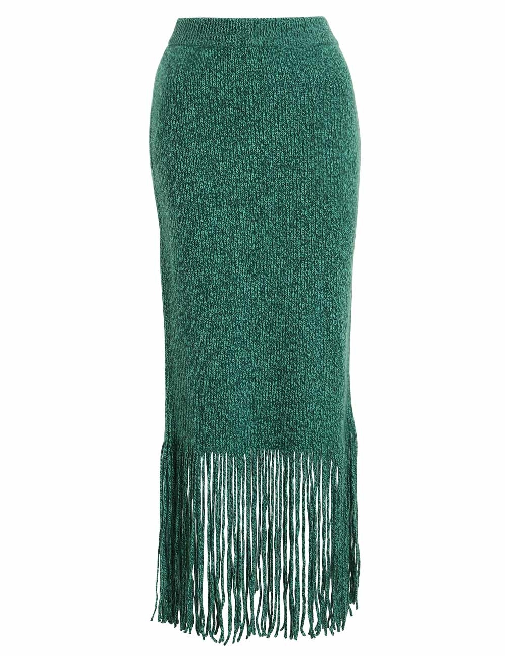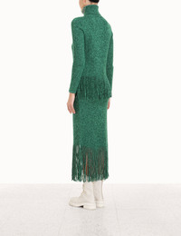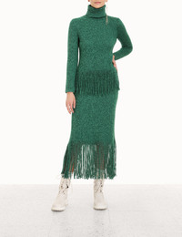 ITEM DETAILS The Celestial Tassel Midi Skirt in Emerald from our Fall 2022 Collection, Stargazer. A knitted midi skirt crafted from cashmere and merino wool, featuring an elastic waist and tassels descending from the hem. - Knit midi skirt - Cashmere and merino blend - Elastic waist - Tassel detailing Style Code: 4323SCEL STYLING Style the Celestial Tassel Midi Skirt with the Celestial Tassel Top with the Crescent Chain Sandal for a fun, tonal look. Wear this style with the Crescent Slingback Pump, Celestial Tassel Top and Shooting Star Mismatch Earrings by ZIMMERMANN SIZE DETAILS 0P 0 1 2 3 Waist 118 62 66 72 78 Hip 72 78 82 88 96 Length 89 97 97 97 97 This garment fits true to size, we recommend you select your normal size. Slim fit, stretch knit. Available in size 0P, specially designed with petite proportions that are suited to clients who are under 5'3"/ 160cm. Our model is 5'9.5" / 178 cm, bust size 32C/10C and is wearing a size 0. CARE INSTRUCTIONS 55% cashmere 45% merino wool Exclusive of trims Gentle cold hand wash separately with mild detergent Do not bleach Do not soak, wring or rub Do not tumble dry Dry flat inside out, away from direct sunlight Cool iron on reverse Store garment flat, do not hang Always check the garment care label for specific care instructions