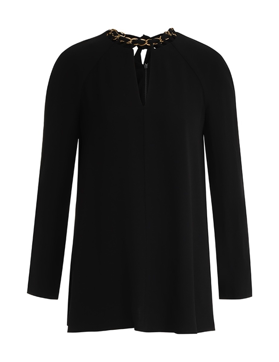 ITEM DETAILS The Chain Embellished Tunic Top in Black from our Fall 2023 Collection, Luminosity. A long sleeve tunic top featuring a chain detail neckline and necktie. - Long sleeve tunic top - Centre back zip - Lined Style Code: 7894TRF23 SIZE DETAILS 0P 0 1 2 3 Length 69 73 73 74 75 Bust 86 92 96 102 108 Waist 96 102 106 112 118 Sleeve 69 73 74 75 76 Relaxed fit This garment fits true to size Available in size 0P, suited to clients who are under 5'3"/ 160cm Model is 5'9.5"/178 cm, bust size 32C/10C and wears a size 0 Item measurements have been rounded to the nearest cm. CARE INSTRUCTIONS Main: 100% viscose Exclusive of trims Dry clean only code p with protective bag Cover and protect hardware Cool iron on reverse Do not spot clean Always check the garment care label for specific care instructions.