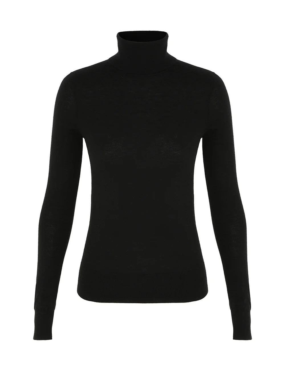 ITEM DETAILS The Cashmere Turtleneck Sweater in Black from our Fall 2025 Collection, Hypnotic. A cashmere sweater featuring a ribbed roll neck, cuffs and hem. - 100% cashmere - Slim fit silhouette - Ribbed neck, hem and cuffs Style Code: 8108TF25R SIZE DETAILS 0P 0 1 2 3 4 Length 54 57 58 59 59 60 Bust 76 82 88 92 98 102 Sleeve 57 61 62 63 63 64 Designed for a close fit This garment fits true to size Available in size 0P, suited to clients who are under 5'3"/ 160cm Model is 5'9.5"/178 cm, bust size 32C/10C and wears a size 0 Item measurements have been rounded to the nearest cm CARE INSTRUCTIONS 100% cashmere Dry clean only code f (hydrocarbon only); Remove any detachable trims prior to dry cleaning; Cover to protect trim; Cool iron with protective cloth; Do not spot clean; Store garment flat do not hang Always check the label or care card for specific care instructions.