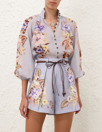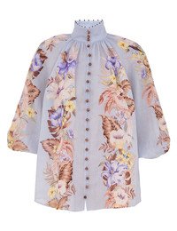 ITEM DETAILS The Coco Billow Blouse in Powder Blue Multi Floral from our Summer Swim 2025 Collection. A ramie placement print blouse featuring rouleau loops and buttons down the centre front. - 100% ramie fabric - High neckline with gathering - Elasticated sleeve cuffs for versatile sleeve length - Rouleau loops with beaded buttons - Wooden beaded detail along the stand collar Exclusive: This style featured on Summer Swim 2025 and only available at ZIMMERMANN stores and online. Style Code: 4538TSS254 SIZE DETAILS 0P 0 1 2 3 4 Length 24.5 26.5 27 27 27 27.5 Bust 42.5 44 46.5 49 50.5 53 Sleeve 24.5 25.5 26 26.5 27 27 Designed for a relaxed fit This garment fits true to size Available in size 0P, suited to clients who are under 5'3"/ 160cm Model is 5'9.5"/178 cm, bust size 32C/10C and wears a size 0 Item measurements are in inches CARE INSTRUCTIONS Main: 100% ramie Dry clean only code f (hydrocarbon only); Remove any detachable trims prior to dry cleaning; Cover to protect trim; Cool iron with protective cloth; Light steam only; Do not spot clean Always check the label or care card for specific care instructions.