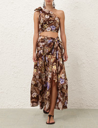 ITEM DETAILS The Coco Bow Maxi Skirt in Chocolate Multi Floral from our Summer Swim 2025 Collection. A cotton maxi skirt featuring gathering at the waist with side bow and a shirred elastic back across the center back, with invisible zip closure. - 100% cotton fabric - Wrap tie detail across front waistband - Centre back zipper with hook and eye closure - Gathered skirt with front left split Campaign: This style was featured in the Summer Swim 2025 Campaign. Style Code: 3779SSS254 SIZE DETAILS 0P 0 1 2 3 Length 37 40.5 40.5 40.5 40.5 Waist 29 30 32.5 34 35.5 Hip 31.5 34 35.5 38 39.5 Designed to be fitted at waist and hip, relaxed through the legs This garment fits true to size Available in size 0P, suited to clients who are under 5'3"/ 160cm Model is 5'9.5"/178 cm, bust size 32C/10C and wears a size 0 Item measurements are in inches CARE INSTRUCTIONS Main: 100% cotton; lining: 100% cotton Dry clean only code f (hydrocarbon only); Remove any detachable trims prior to dry cleaning; Cover to protect trim; Cool iron with protective cloth; Light steam only; Do not spot clean Always check the label or care card for specific care instructions.