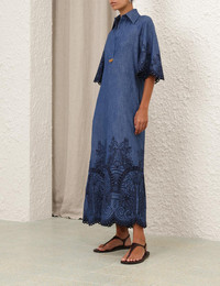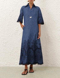 ITEM DETAILS The Coco Embroidered Denim Dress in Railway Blue from our Summer Swim 2025 Collection. A denim maxi dress featuring a classic collar, V-neckline and raglan sleeves, finished with a pleated skirt. - Denim tunic dress - Quarter length raglan sleeves with lace trim - Gathered skirt - Scalloped edging - Functional side pockets - Embroidered throughout - Slip on style Style Code: 3172DSS254 SIZE DETAILS 0P 0 1 2 3 4 Length 47 51.5 52 52 52.5 53 Sleeve 19.5 20.5 21 21 21.5 21.5 Designed for a relaxed, loose fit This garment fits true to size Available in size 0P, suited to clients who are under 5'3"/ 160cm Model is 5'9.5"/178 cm, bust size 32C/10C and wears a size 0 Item measurements are in inches CARE INSTRUCTIONS Main: 100% cotton embroidery: 100% polyester Gentle cold machine wash separately with mild detergent; Remove any detachable trims prior to cleaning Cover to protect trim; Do not soak or bleach; Do not tumble dry; Dry in shade without delay; Cool iron with protective cloth; Do not spot clean; Dry cleanable code p Always check the label or care card for specific care instructions.