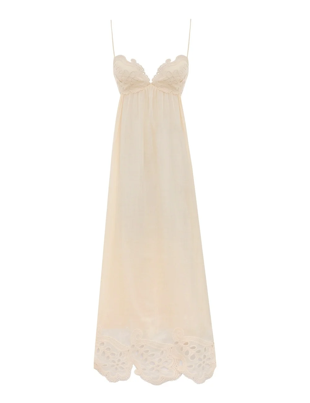 ITEM DETAILS The Coco Embroidered Dress in Cream from our Summer Swim 2025 Collection. A ramie maxi dress featuring embroidery detail throughout, a V-neckline and a shirred back, finished with a gathered waist. - 100% ramie fabric - Scalloped lace trim - Adjustable shoulder straps - Shirred elastic across the back with hook and eye closure - Invisible zip at scooped lower back - Skirt is lined Style Code: 2929DSS254 SIZE DETAILS 0P 0 1 2 3 Length 34.5 37.5 37.5 37.5 37.5 Bust 16.5 17.5 19 19.5 21.5 Waist 18 19.5 20.5 22 23 Designed for a slightly loose fit, with a closer fit at the bust This garment fits true to size Available in size 0P, suited to clients who are under 5'3"/ 160cm Model is 5'9.5"/178 cm, bust size 32C/10C and wears a size 0 Item measurements are in inches CARE INSTRUCTIONS Main: 100% ramie, contrast: 100% linen, bodice lining: 100% linen, embroidery: 100% polyester, lining: 100% cotton, trim: 100% polyester Dry clean only code f (hydrocarbon only); Remove any detachable trims prior to dry cleaning; Cover to protect trim; Cool iron with protective cloth; Light steam only; Do not spot clean Always check the label or care card for specific care instructions.