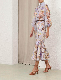 ITEM DETAILS The Coco Fit and Flare Midi Skirt in Powder Blue Multi Floral from our Summer Swim 2025 Collection. A fitted linen midi skirt featuring a removable waist belt and frill detailing at the hem, finished with a wooden bead edge trim. - 100% linen fabric - Fitted skirt with panel seams at the front and back - Removable wooden beaded belt - Invisible zip at centre back with hook and eye - Gather side hem frills - Unlined skirt Style Code: 3489SSS254 SIZE DETAILS 0P 0 1 2 3 4 Length 31 34.5 34.5 34.5 34.5 34.5 Waist 25 26 28.5 30.5 32.5 34.5 Hip 34.5 37 39.5 41 43.5 45 Designed to be fitted across the waist and hips, relaxed through the legs Light-weight, non-stretchy fabric This garment fits true to size Available in size 0P, suited to clients who are under 5'3"/ 160cm Model is 5'9.5"/178 cm, bust size 32C/10C and wears a size 0 Item measurements are in inches CARE INSTRUCTIONS Main: 100% linen Dry clean only code f (hydrocarbon only); Remove any detachable trims prior to dry cleaning; Cover to protect trim; Cool iron with protective cloth; Light steam only; Do not spot clean Always check the label or care card for specific care instructions.