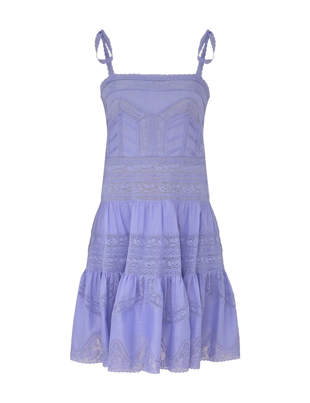 ITEM DETAILS The Coco Lace Mini Dress in Jacaranda Blue from our Summer Swim 2025 Collection. A cotton lace dress featuring a pintuck lace trim bodice, bow-tie shoulder straps and a frilled hem. - 100% cotton fabric - Square neckline - Self tie shoulder straps - Invisible zip closure at centre back - Lace trims throughout Style Code: 4576DSS254 SIZE DETAILS 0P 0 1 2 3 4 Length 33 35 35.5 36 36.5 Bust 31.5 33 35.5 38 39.5 Designed for a slightly loose fit, with a closer fit at the bust This garment fits true to size Available in size 0P, suited to clients who are under 5'3"/ 160cm Model is 5'9.5"/178 cm, bust size 32C/10C and wears a size 0 Item measurements are in inches CARE INSTRUCTIONS Main: 100% cotton; lining: 100% cotton; trim: 100% cotton; trim: 100% polyester Dry clean only code f (hydrocarbon only); Remove any detachable trims prior to dry cleaning; Cover to protect trim; Cool iron with protective cloth; Light steam only; Do not spot clean Always check the label or care card for specific care instructions.