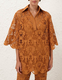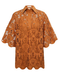 ITEM DETAILS The Coco Lace Tunic Top in Biscuit from our Summer Swim 2025 Collection. A lace top featuring a classic collar, V-neckline, scalloped edges and loose sleeves. - Lace tunic top - Quarter-length loose sleeves with wide cuffs - Scalloped edges at the cuffs and hems - Comes with separate cami Style Code: 4483TSS254 SIZE DETAILS 0P 0 1 2 3 Length 29 31 31.5 32.5 32.5 Sleeve 14.5 15.5 15.5 15.5 15.5 Designed for a relaxed, loose fit This garment fits true to size Available in size 0P, suited to clients who are under 5'3"/ 160cm Model is 5'9.5"/178 cm, bust size 32C/10C and wears a size 0 Item measurements are in inches CARE INSTRUCTIONS Main: 100% polyester; contrast: 100% cotton; slip: 100% cotton Dry clean only code f (hydrocarbon only); Remove any detachable trims prior to dry cleaning; Cover to protect trim; Cool iron with protective cloth; Light steam only; Do not spot clean Gentle cold hand wash separately with mild detergent; Remove any detachable trims prior to cleaning; Cover to protect trim; Do not soak, rub or wring; Do not bleach; Dry in shade; Cool iron with protective cloth; Do not tumble dry; Do not spot clean; Dry cleanable code f (hydrocarbon only); Always check the label or care card for specific care instructions.