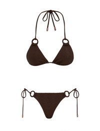 ITEM DETAILS The Coco Texture Ring Bikini in Chocolate from our Summer Swim 2025 Collection. An Italian lycra triangle bikini top and low rise, skinny pant featuring rings throughout and self tie straps with toggle ends. - Lycra bikini set with metallic finish - Medium bottom coverage - Rings attached to self tie straps - Lined Style Code: 4386WSS254 SIZE DETAILS This garment fits true to size Model is 5'10.5"/179 cm, bust size 34C/12C and wears a size 0 CARE INSTRUCTIONS Main: 74% polyamide, 13% metallic, 13% elastane; lining: 92% recycled nylon, 8% spandex Do not roll up when wet; Rinse thoroughly after use; Remove any detachable trims prior to washing; Cold hand wash separately with mild detergent, avoid fabric softener; Dry in shade; Do not bleach or iron; Do not tumble dry; Do not dry clean; Light colours may be transparent when wet; Avoid contact with sunscreens, oils and rough surfaces; Avoid high temperature pools and spas treated with harsh chemicals Always check the label or care card for specific care instructions.