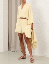 ITEM DETAILS The Coco Towelling Short in Yellow/Cream from our Summer Swim 2025 Collection. A terry towelling short featuring an elasticated waistband and embroidery detailing throughout, finished with a fringe hem. - 100% cotton fabric - Mid-rise short - Shirred waistband with drawstring and toggle ends - Fringe edging on hem - Functional side pockets - ZIMMERMANN embroidered on front and back Style Code: 3596ASS254 SIZE DETAILS 0P 0 1 2 3 Length 14 15 15.5 15.5 15.5 Waist 23.5 24.5 27 29 30.5 Inseam 3 3 3 3 3 Designed with an elasticated waist for a flexible fit This garment fits true to size Available in size 0P, suited to clients who are under 5'3"/ 160cm Model is 5'9.5"/178 cm, bust size 32C/10C and wears a size 0 Item measurements are in inches CARE INSTRUCTIONS Main: 100% cotton; pocketing: 100% cotton Gentle cold hand wash separately with mild detergent Remove any detachable trims prior to washing Do not soak, rub or wring Do not bleach Do not tumble dry Dry flat in shade; Cool iron with protective cloth; Do not spot clean; Do not dry clean Always check the label or care card for specific care instructions.