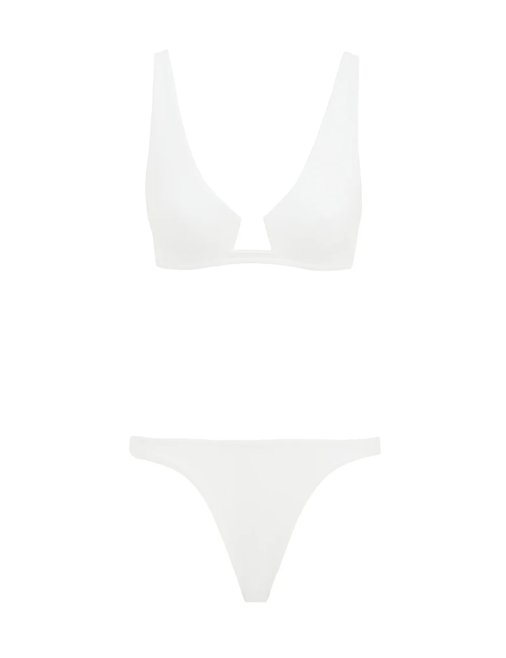 ITEM DETAILS The Coco Wire Front Bikini in Ivory from our Summer Swim 2025 Collection. A lycra bikini set featuring a plunging V-neckline, wire-front design for added support and a matching low rise classic pant. - Lycra bikini set - Bikini top with keyhole cut-out at bust - Wiring for bust support - Adjustable straps - Back clasp closure - Low rise, full coverage bottoms - Lined Style Code: 1065WSS254 SIZE DETAILS This garment fits true to size Model is 5'10.5"/179 cm, bust size 34C/12C and wears a size 0 CARE INSTRUCTIONS Main: 75% polyamide, 25% elastane; lining: 92% polyamide, 8% elastane Do not roll up when wet; Rinse thoroughly after use; Remove any detachable trims prior to washing; Cold hand wash separately with mild detergent, avoid fabric softener; Dry in shade; Do not bleach or iron; Do not tumble dry; Do not dry clean; Light colours may be transparent when wet; Avoid contact with sunscreens, oils and rough surfaces; Avoid high temperature pools and spas treated with harsh chemicals Always check the label or care card for specific care instructions.